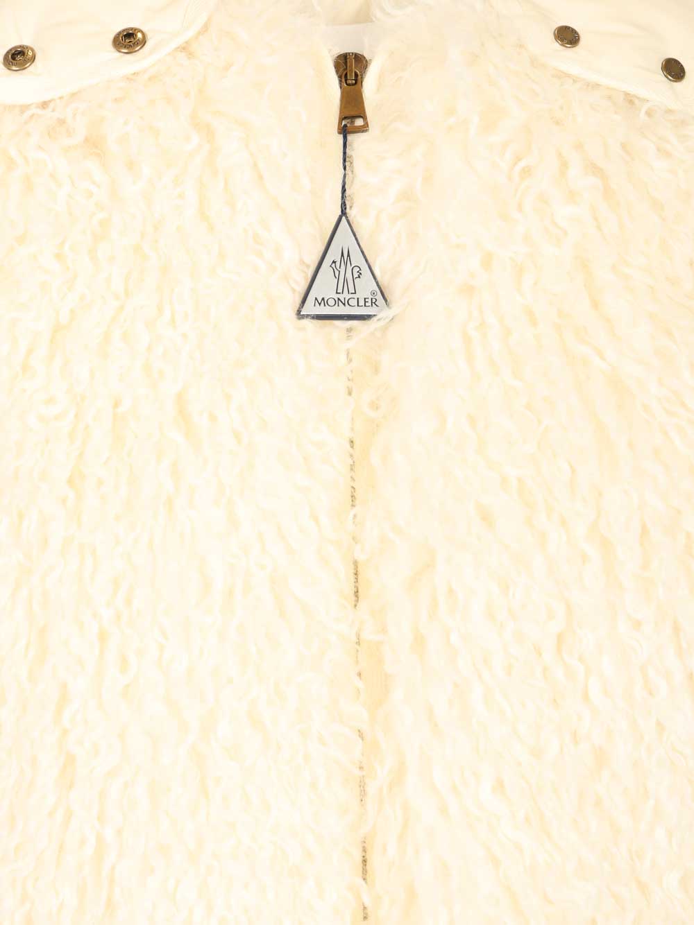 Moncler's short "Vigiers" down jacket in teddy fleece and polyester, with microfibre lining, teddy-style yoke and sleeves, removable hood, zip fastening, buttoned pockets, iconic logo patch.