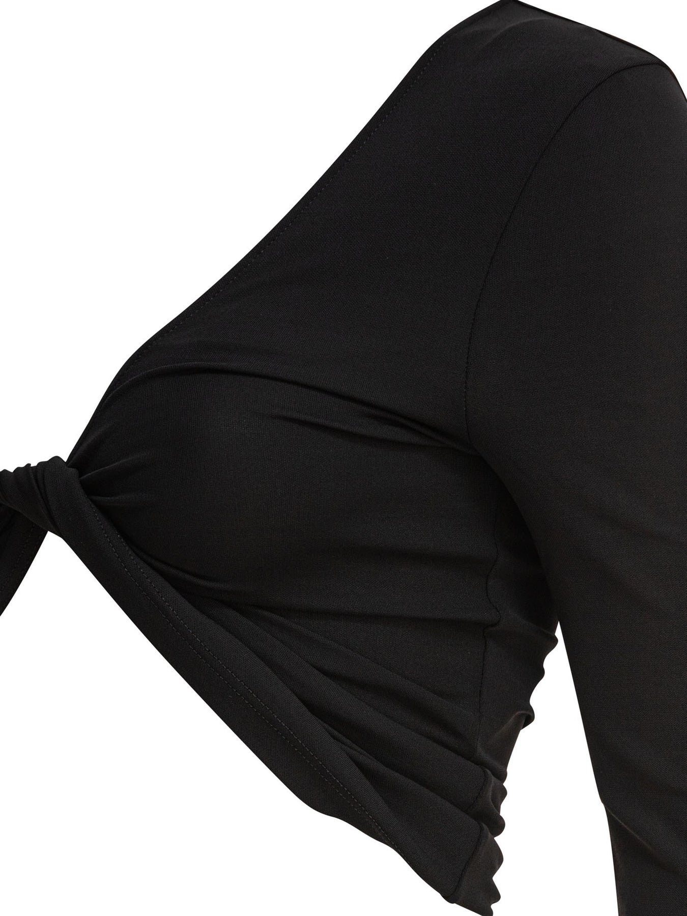 Courrèges one-shoulder crop-top, made from fabric composed of 94% viscose and 6% elastane. The construction features a fitted silhouette with a long-sleeve one-shoulder line and twist front detail. Cropped length defines the compact structure and highlights the upper torso. Stretchy material offers fit and return while maintaining shape during wear. || - Solid color - Long sleeves - One-shoulder design - Cropped length - Twist front detail - Slim fit