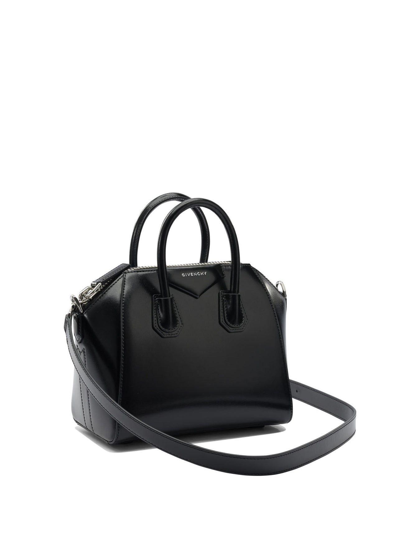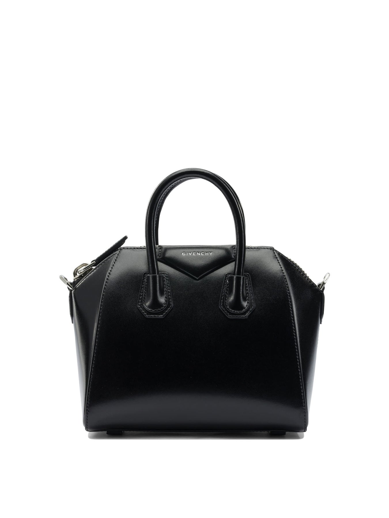 Givenchy "Antigona" handbag, made of leather, features a structured silhouette and essential lines. The construction features two tubular leather handles and a removable and adjustable shoulder strap in the same material. The top is defined by a zipper closure. Lettering logo is placed on the front. The interior is cotton-lined and includes a dedicated zippered pocket. || - Lettering logo on the front - Two tubular leather handles - Removable and adjustable leather shoulder strap - Top zipper closure - Inside zipper pocket - Cotton lining