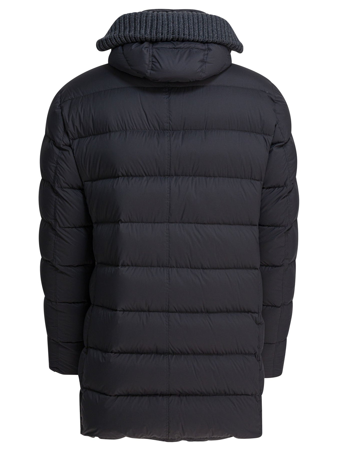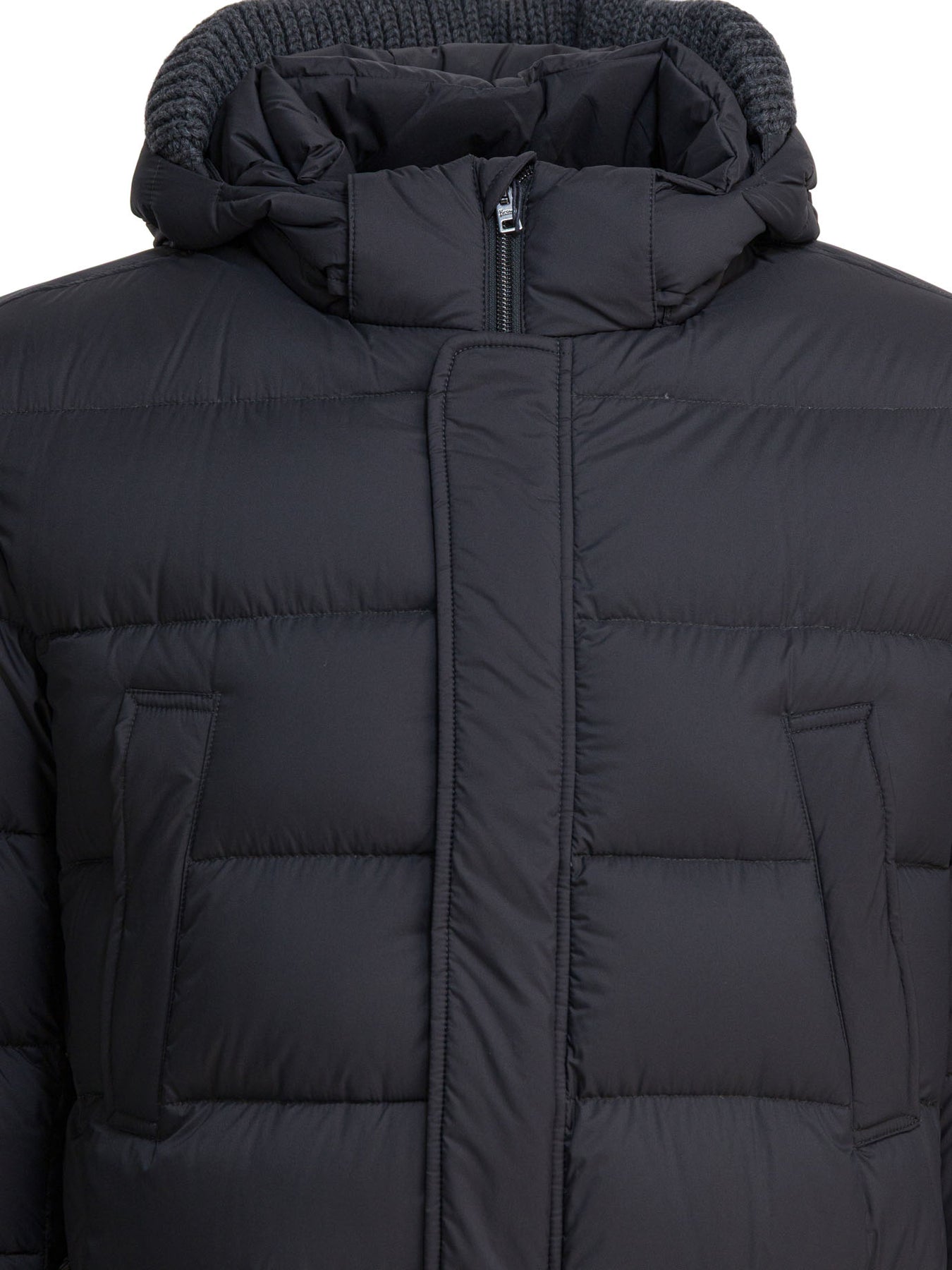 Herno long hooded down jacket with padded construction, made of wool and goose down blend. It features a linear silhouette, extended-length structure and integrated hood. The front closure is concealed by a zipper, while the sleeves are long. The front includes two welt chest pockets and two flap pockets. The hem is straight and the design focuses on functionality and protection from the elements. || - Solid color - Concealed front zipper closure - Two welt pockets on the chest - Two front flap pockets - Straight hem - Regular fit