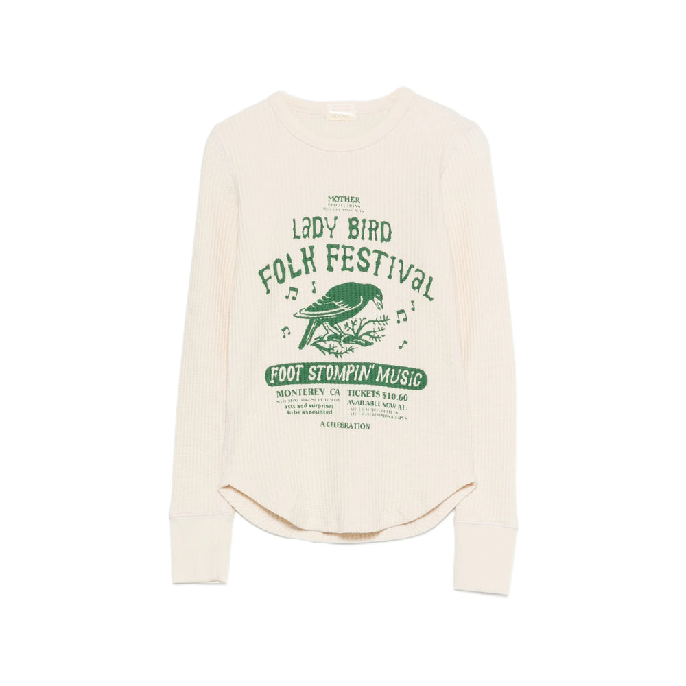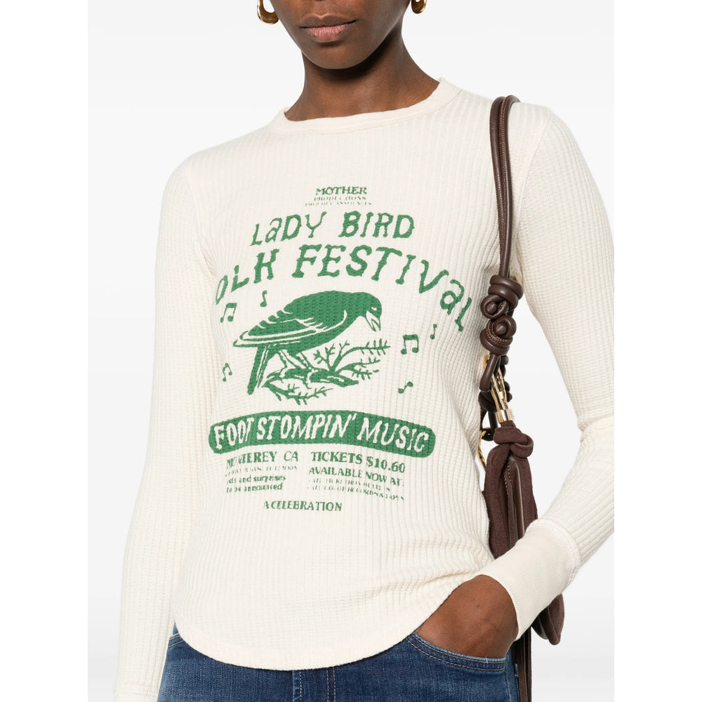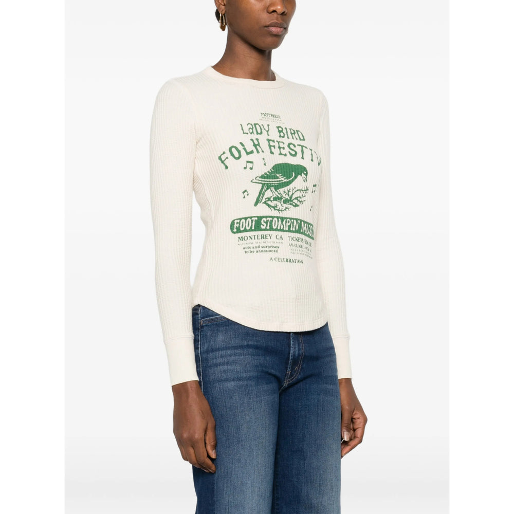 beige print detail long sleeves round neck ribbed trims waffle knit