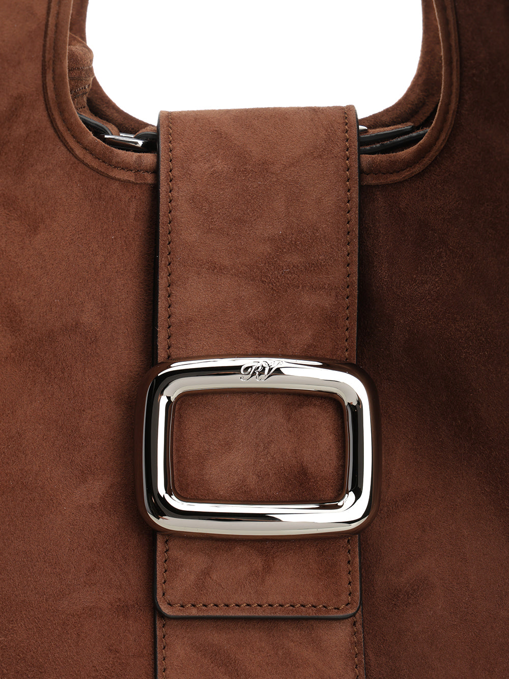 Bag made of goat suede with magnetic flap closure and a metal buckle with the logo, two fixed handles and the width of the internal compartment is adjustable via a strap