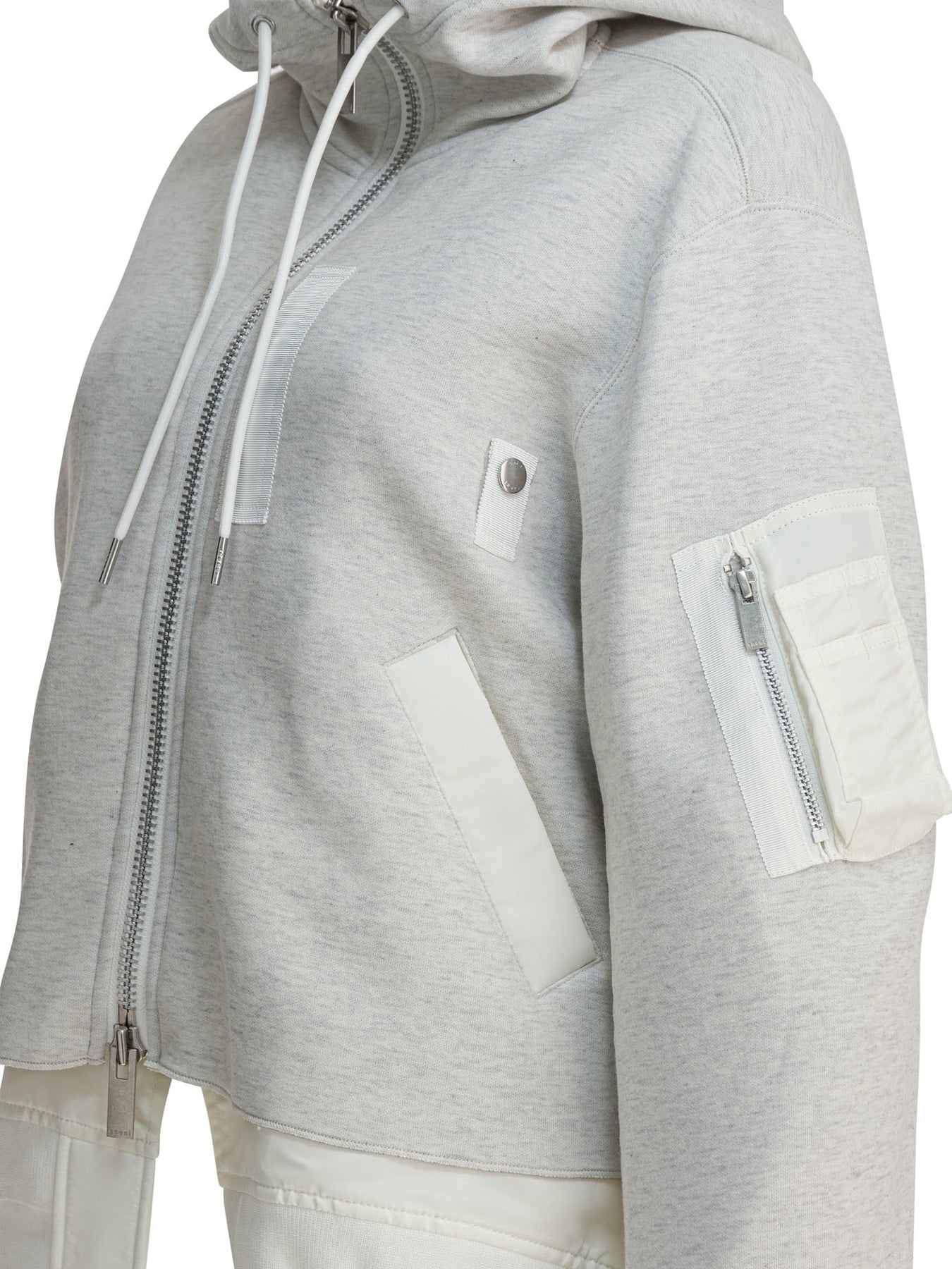 Sacai cotton zippered sweatshirt made of cotton blend with nylon twill inserts. The construction features a regular silhouette with a drawstring-adjustable hood. The construction incorporates a double-slider front zipper closure, a kangaroo pocket and a patch pocket on the sleeve. Contrasting materials emphasize the brand's hybrid approach, combining smooth and textured surfaces. || - Solid color - Long sleeves - Cotton blend with nylon twill panels - Two-way zipper front closure - Adjustable drawstring hood - Kangaroo pocket - Patch pocket on sleeve - Regular fit