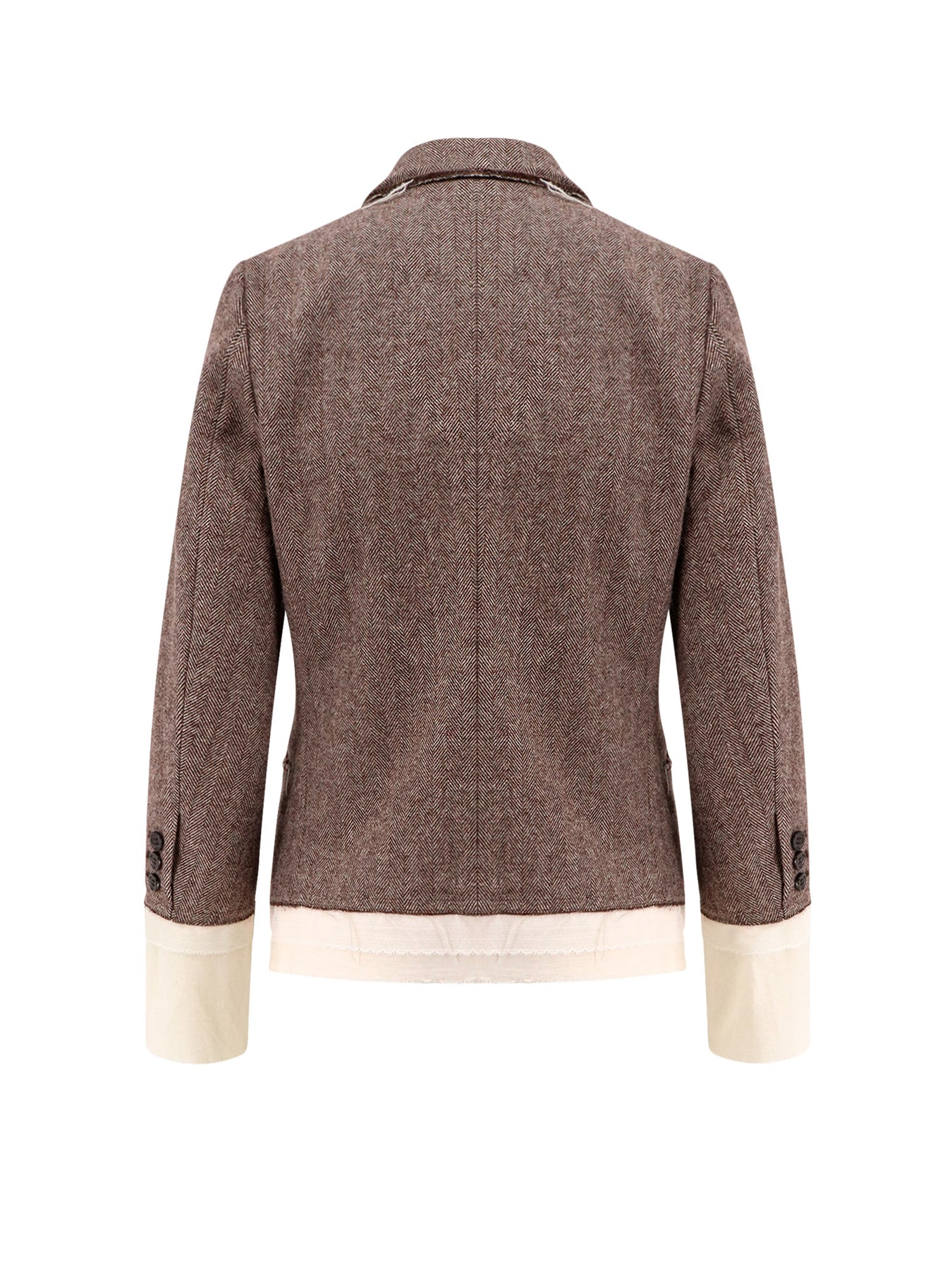 Double-breasted button closure Classic peak lapel Two front welt pockets Lace detail 72% wool, 20% polyester, 4% acrylic, 4% nylon SKU: UP2E1104BROWNBASE