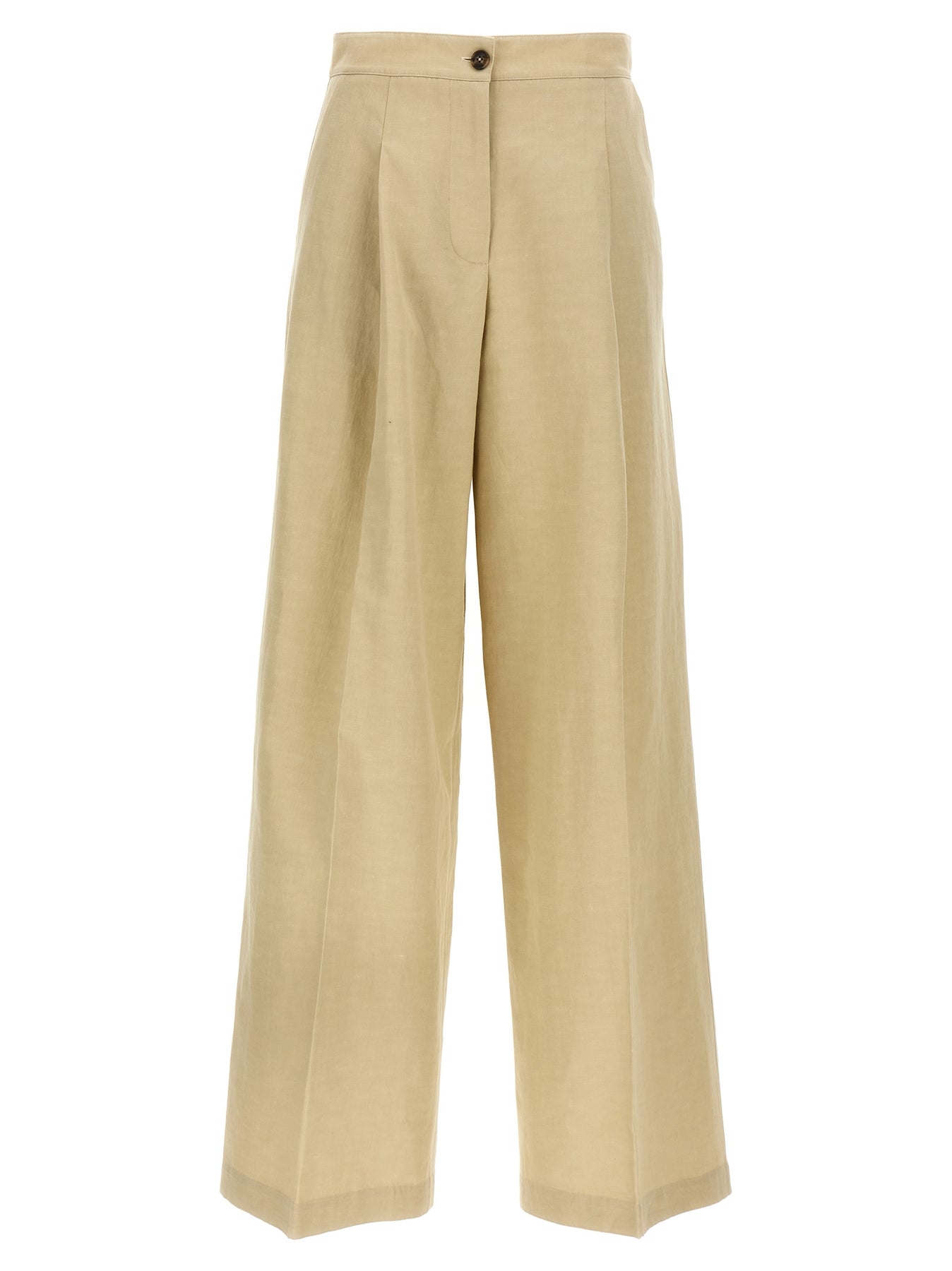 Cotton and linen blend pants, pleats, high waist model, wide and straight leg with pressed pleat, zip and button closure, pockets.