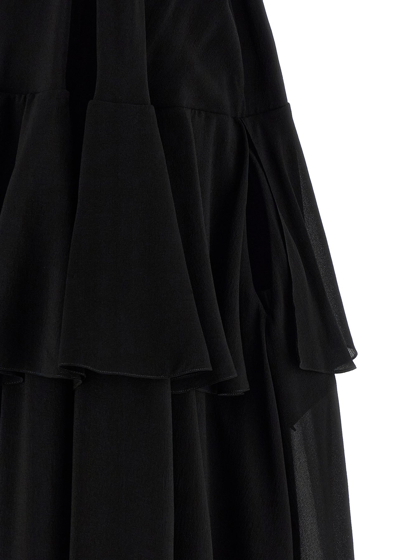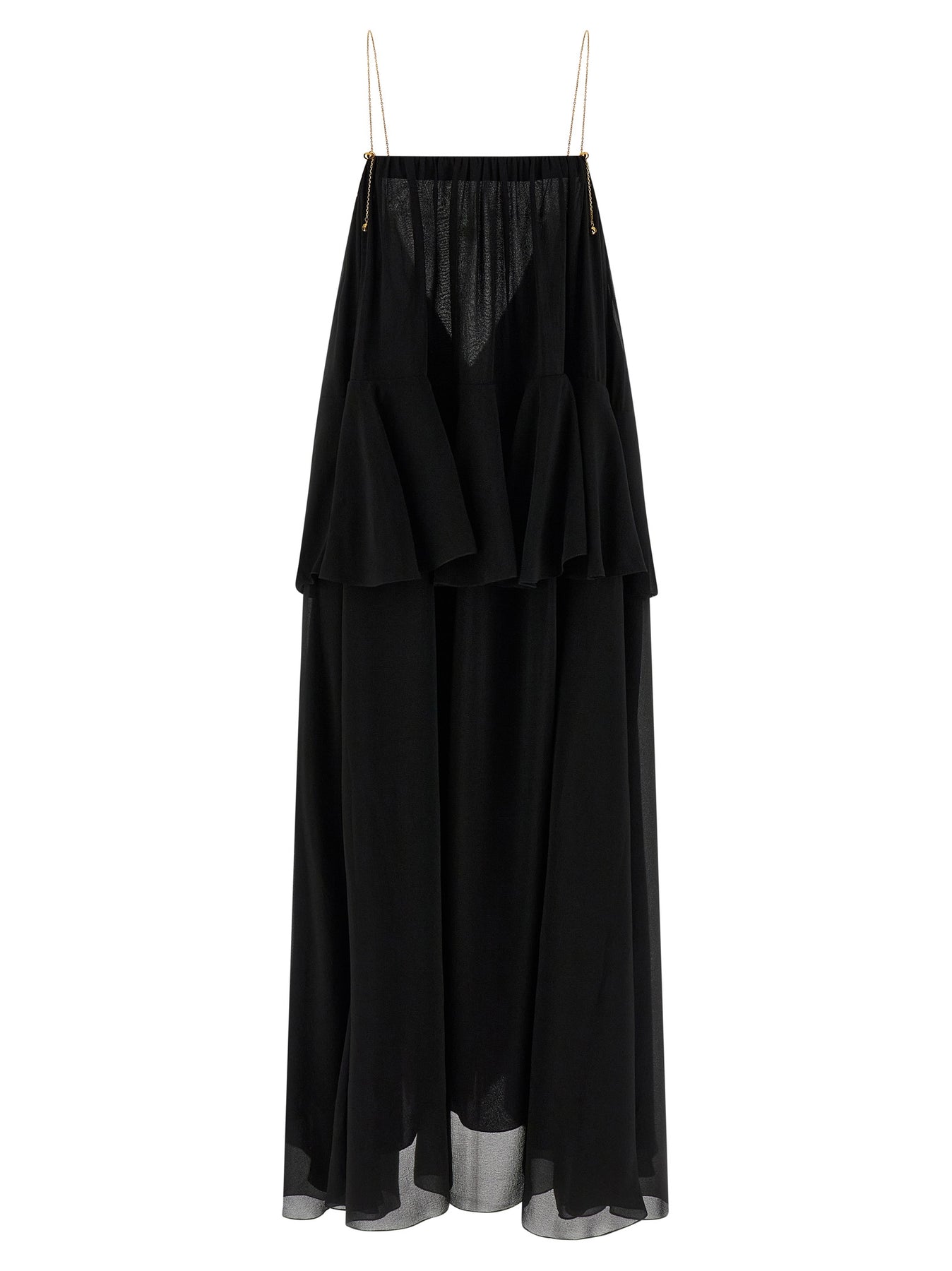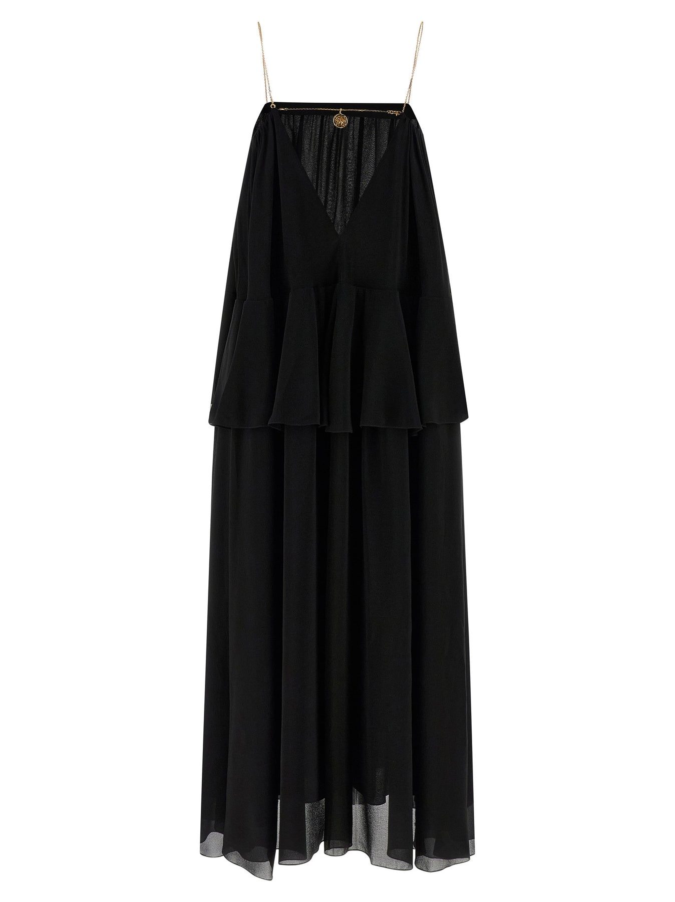 Maxi dress in silk chiffon with V-neck at the back. Gold metal chain shoulder straps, ruffles and ruffles.