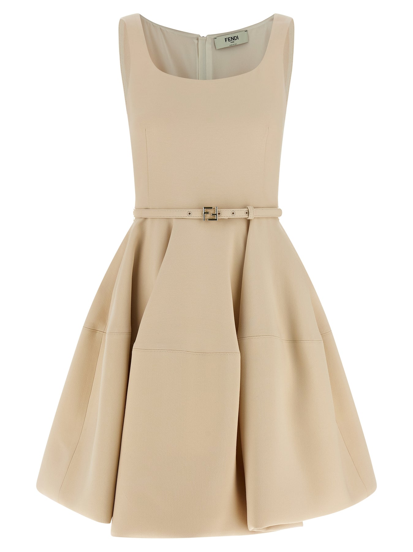 Wool and silk blend mini dress, full skirt, wide round neckline at the front, sleeveless, back zip closure, pockets, belt with removable metallic FF logo buckle.