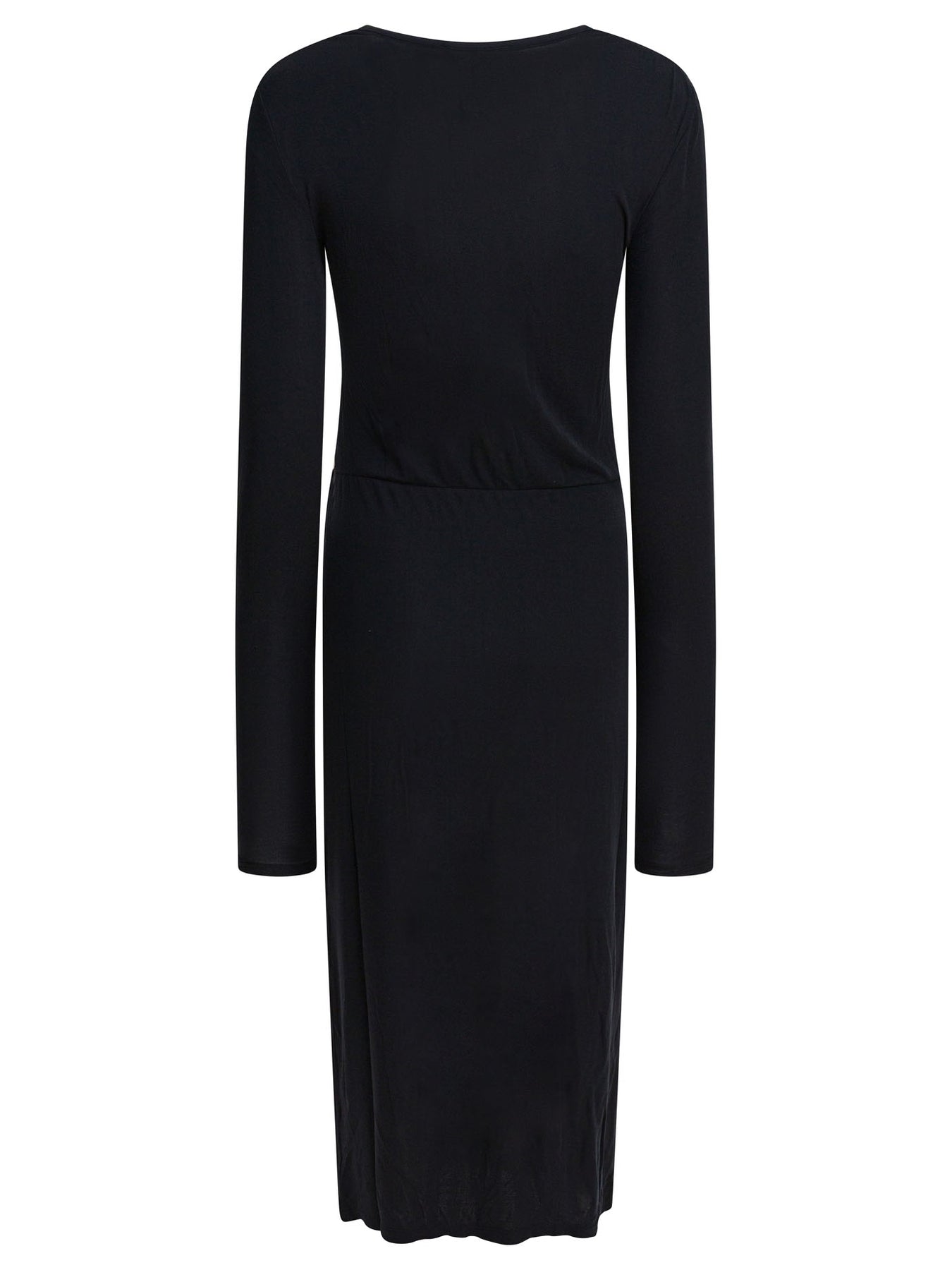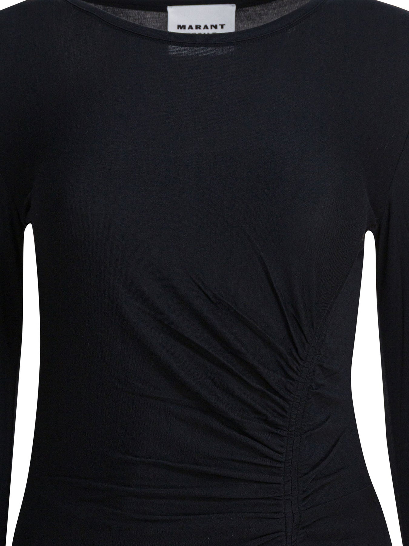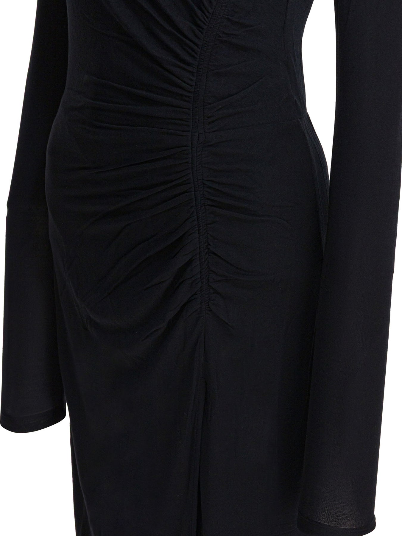 Marant Étoile "Jelina" dress, made of solid-color jersey, features a long, fitted silhouette. The construction incorporates a draped pattern with ruffles placed on the shoulder and front. The garment features a ribbed-finished round neckline, long sleeves and a slit at the front. The construction enhances the body line through studied construction details. || - Solid color - Sheath dress - Long sleeves - Round neckline with ribbed finish - Draping and gathers at shoulder and front - Front slit - Long, fitted cut - Slim fit