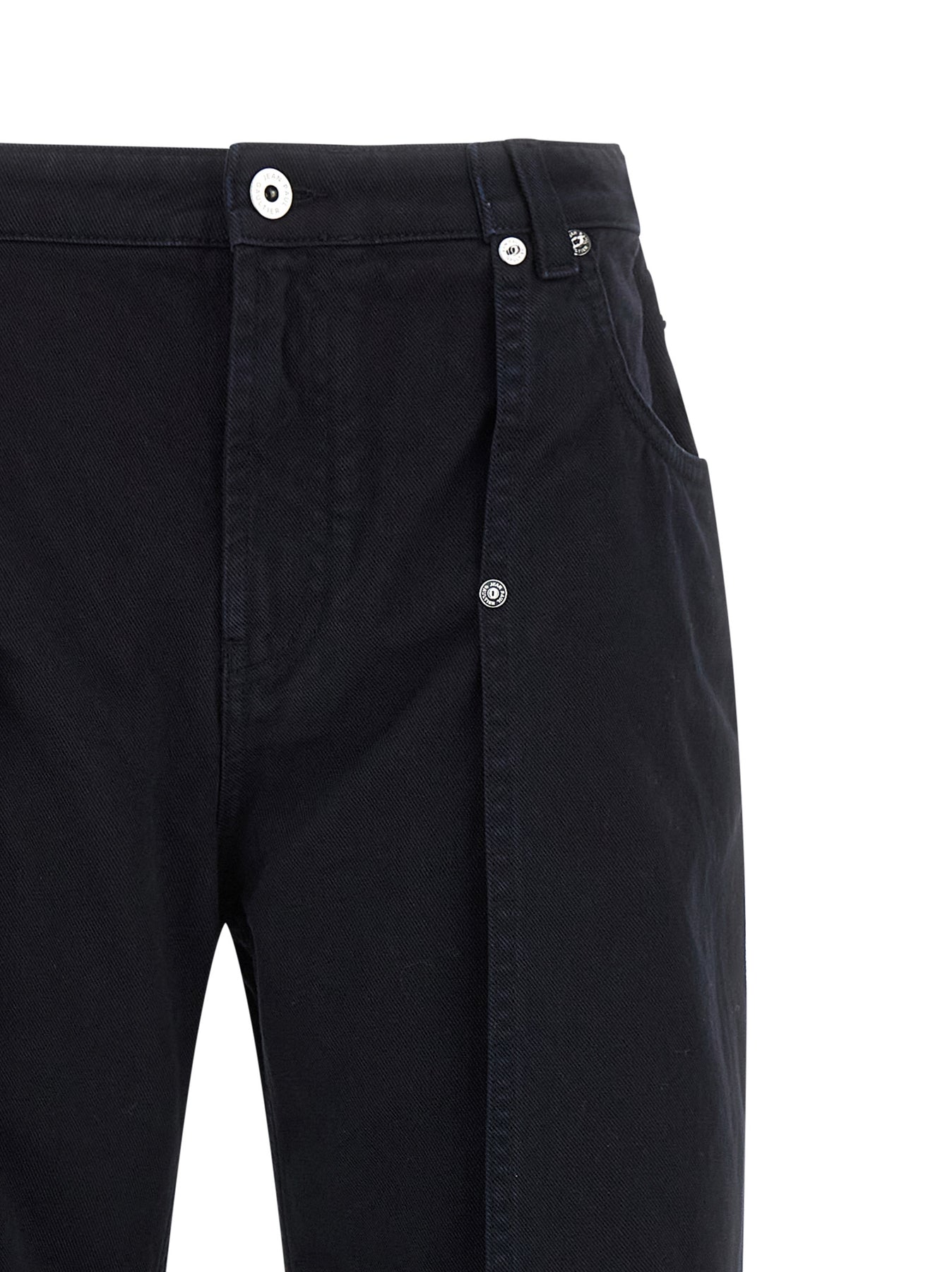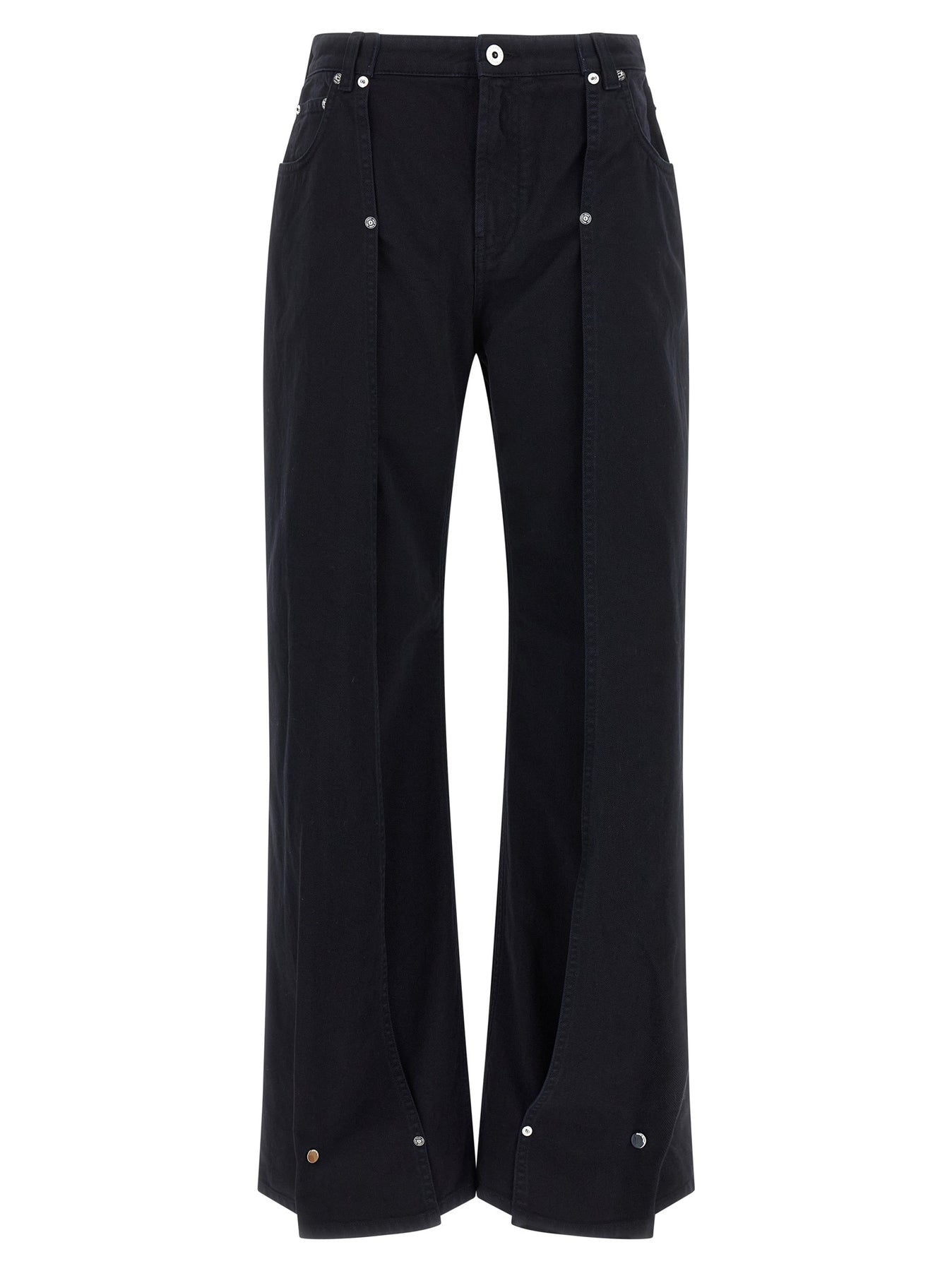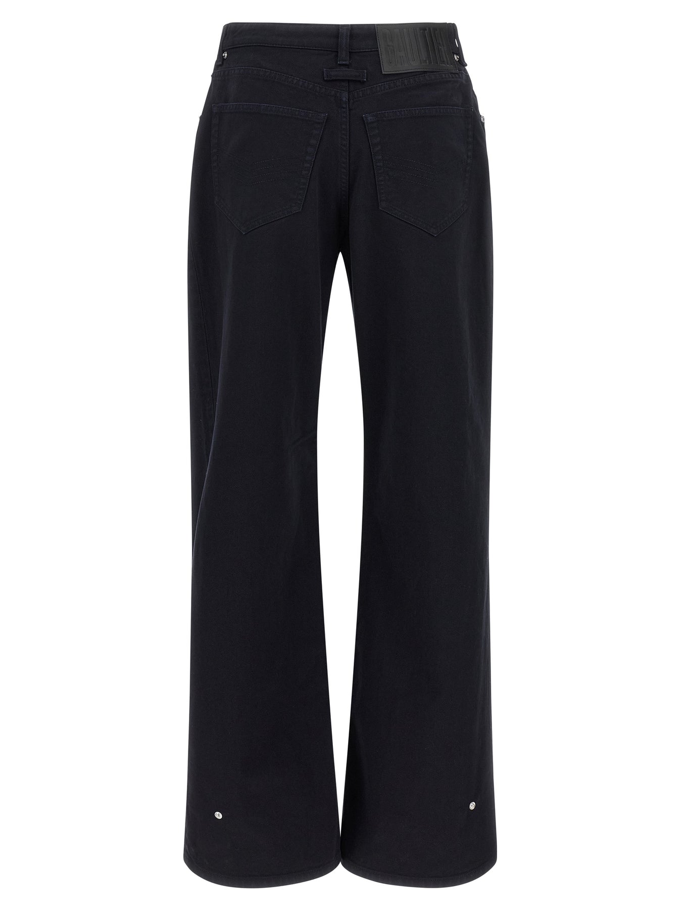 'The Snap-Button Denim' overdyed cotton denim jeans, zip and button closure, wide leg with front cut-out detail and metal rivets, pockets, back logo tag.