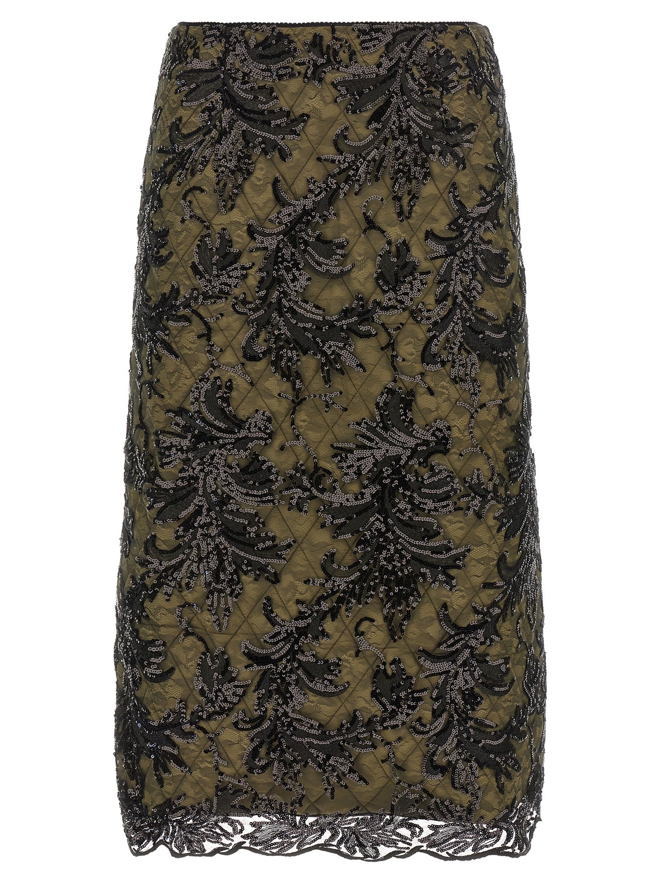Moni' midi skirt in quilted fabric covered in lace with all-over sequin appliqué, longuette model, back zip closure, and asymmetrical hem.