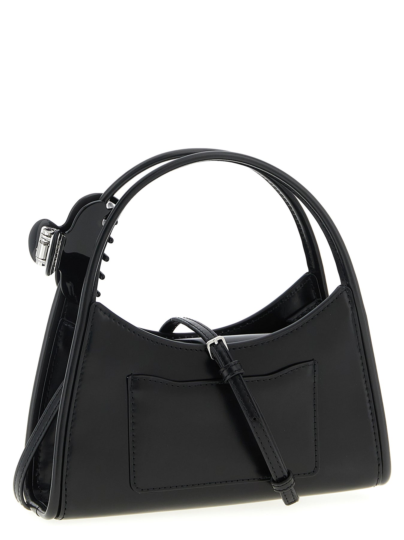 'The Glam Claw Clip' leather crossbody bag, front metal lettering logo, double fixed handle with removable hair clip detail, inner magnetic flap closure, adjustable and removable shoulder strap.