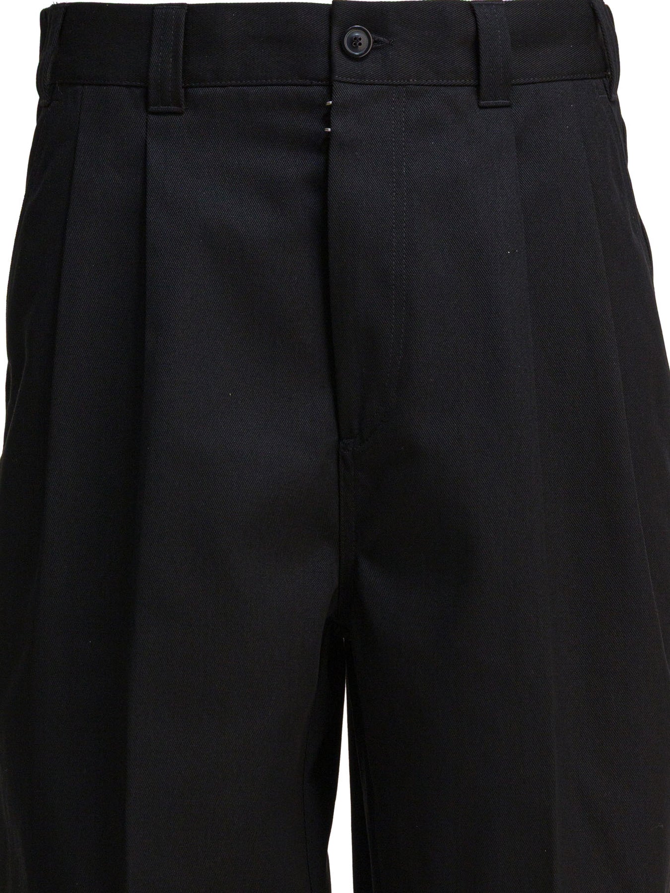 These "Skater Chino" trousers from Maison Margiela combine a modern, casual aesthetic with distinctive details, ideal for the man who seeks style and comfort in a versatile garment. The wide silhouette and pleats make them suitable for a variety of occasions, while the timeless design and Maison's signature attention to detail create a perfect balance between innovation and tradition. || - High waist - Margiela hook - Functional side and back pockets - "Four stitches" detail on the back