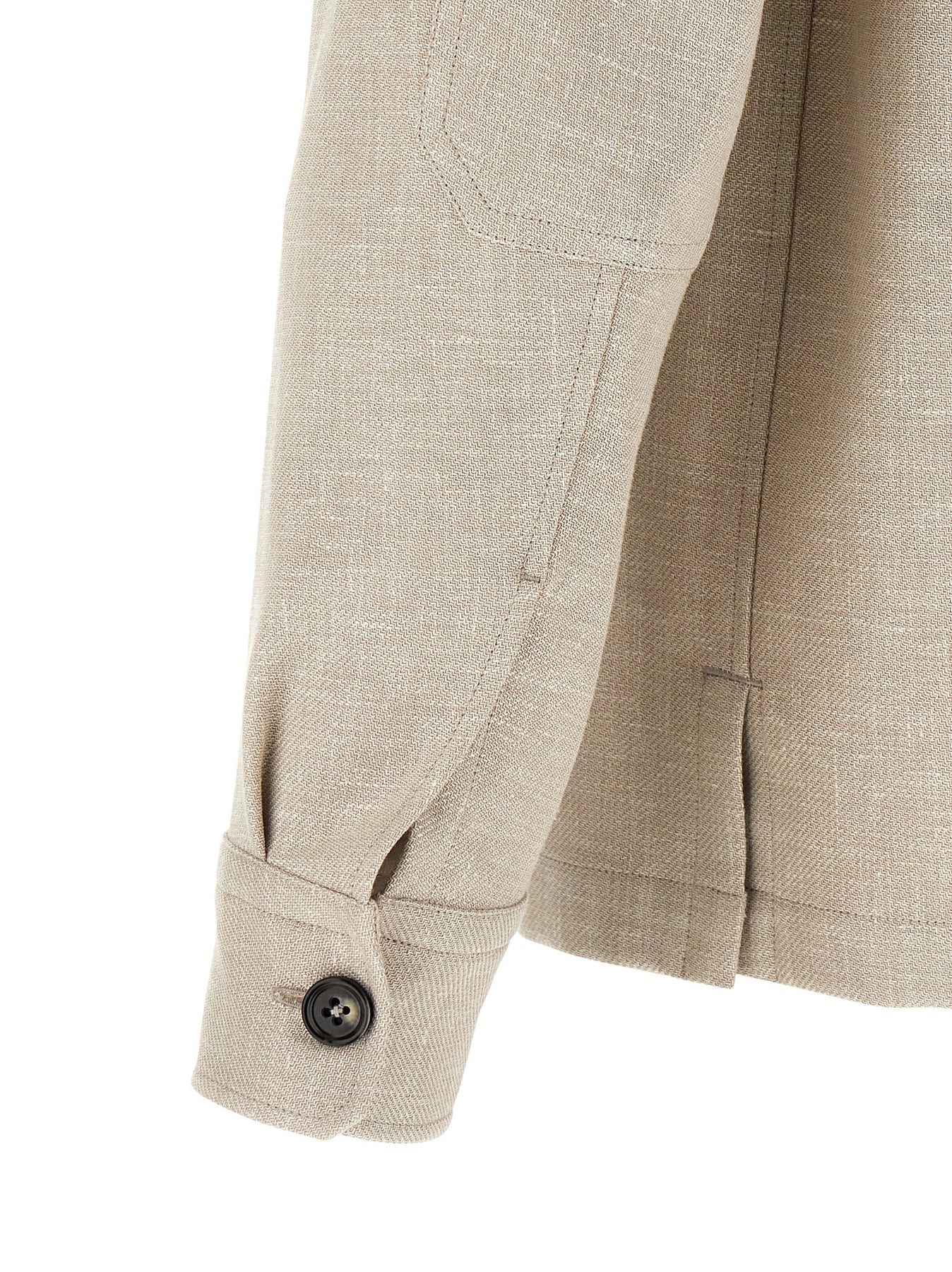 Overshirt in linen, wool and silk 'Crossover' fabric, pointed collar, front horn button closure, pockets, long cuffed sleeves and tone-on-tone patch on the elbow, side slits on the hem, leather 'Zegna 232 Road Brand Mark' on the back.