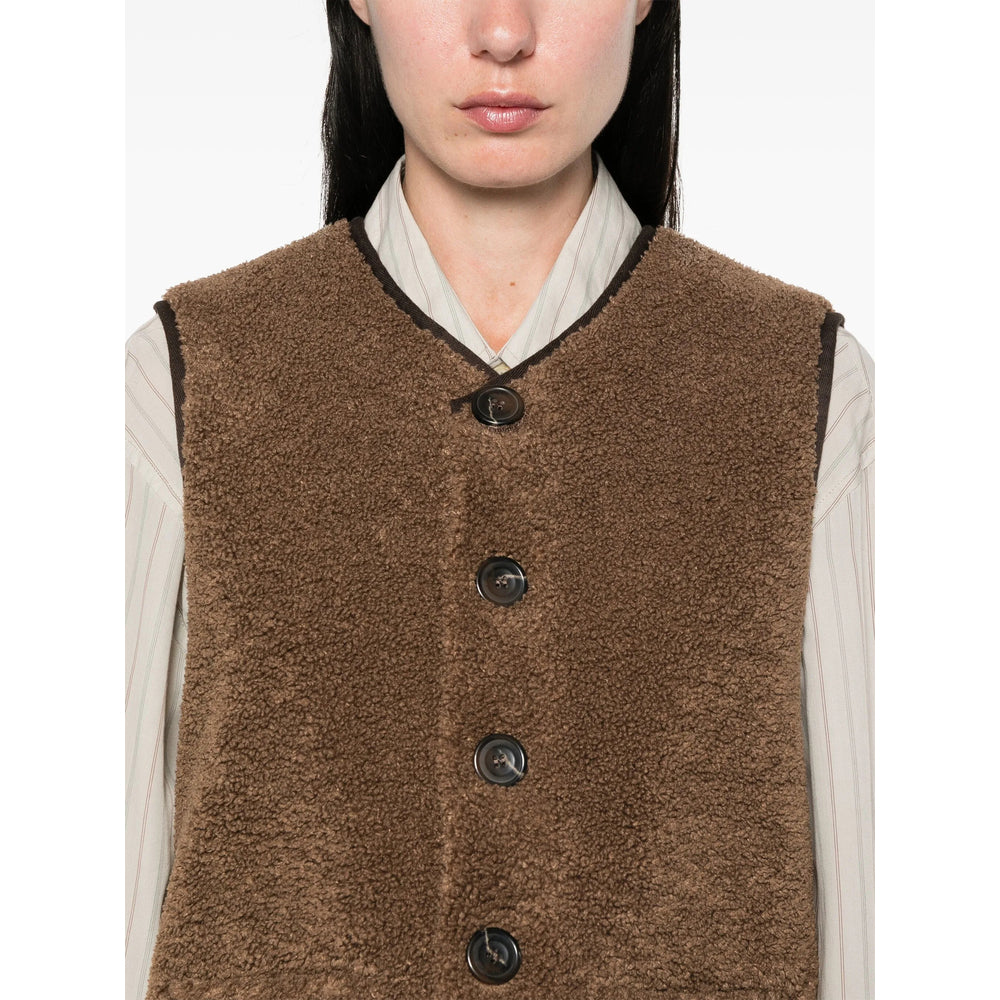 brown cotton faux-shearling design front button fastening round neck sleeveless two side welt pockets curved hem