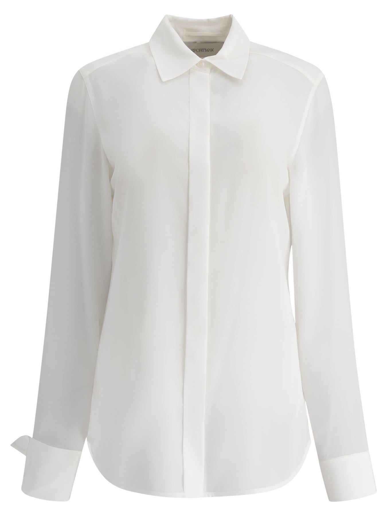 Max Mara Sportmax silk shirt made from pure silk crepe de Chine. The construction features a linear silhouette with a classic collar, concealed front buttoning and back yoke. Structure with long sleeves, double-button cuff and rounded hem. The cut follows the lines of the body, offering a regular fit without additional structural elements. Essential seams emphasize the linearity of the garment. || - Solid color - Classic collar - Long sleeves - Concealed front placket - Cuff closed by double button - Back yoke - Rounded hem - Pure silk crepe de Chine fabric - Regular fit