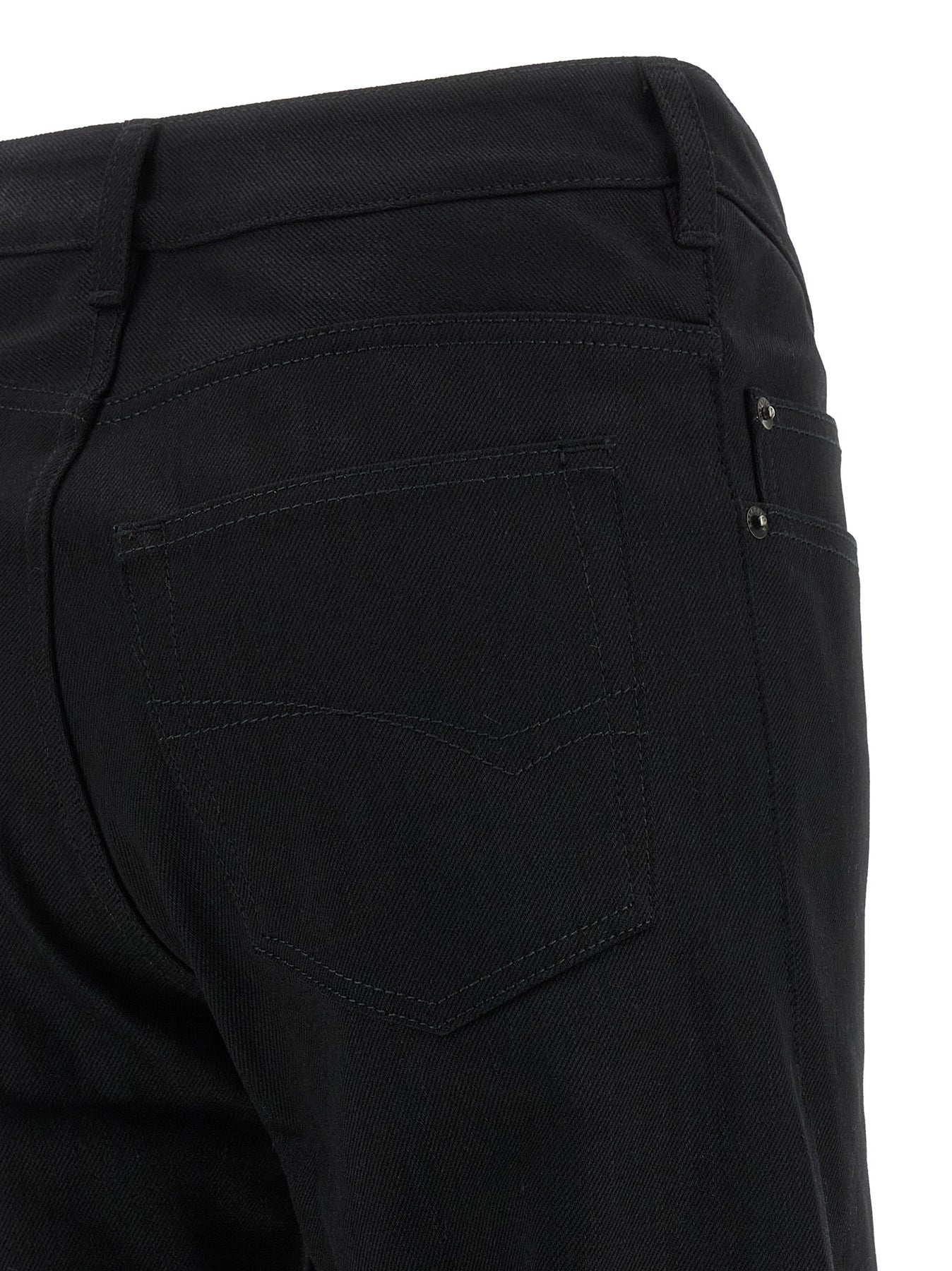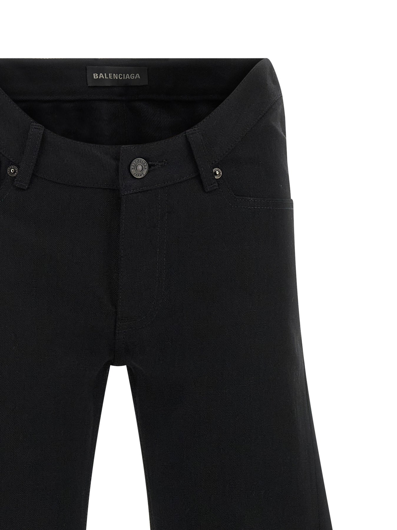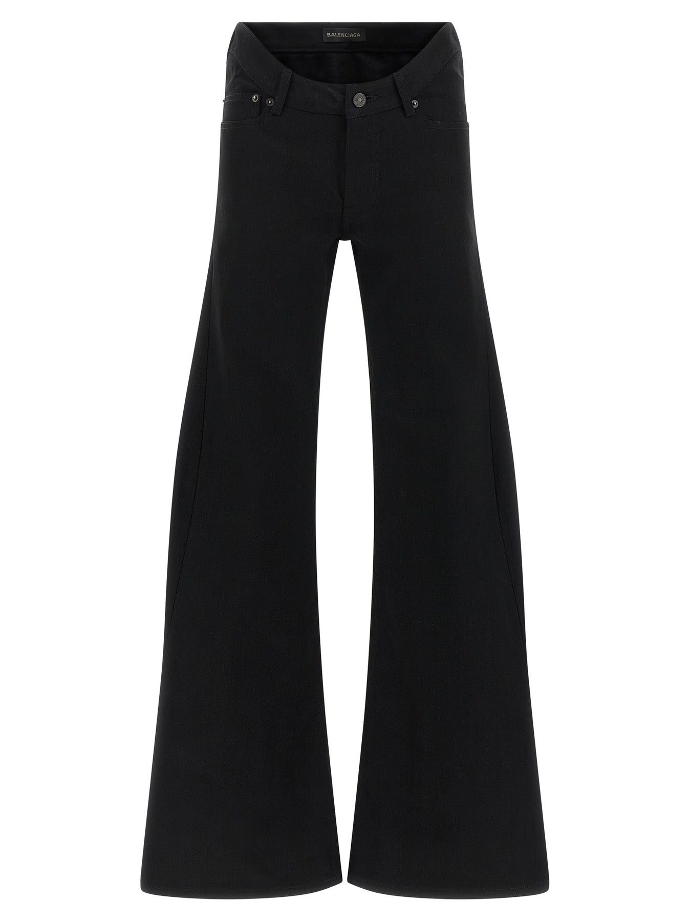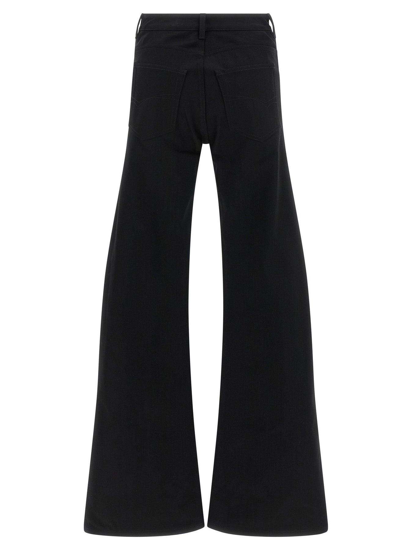 Cotton denim jeans with curved mid waist with rounded front down, five pockets, wide flared leg, zip and front button closure.