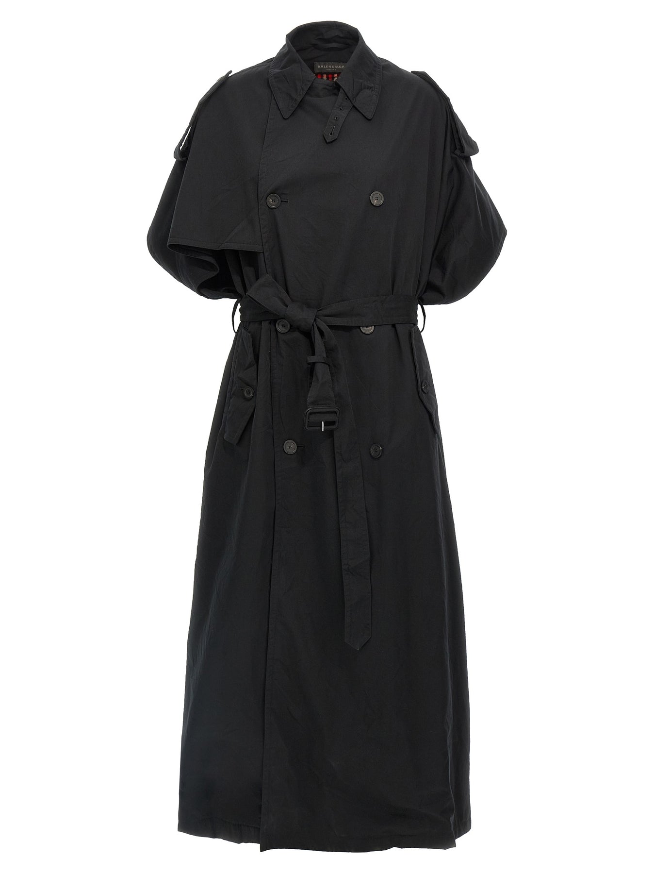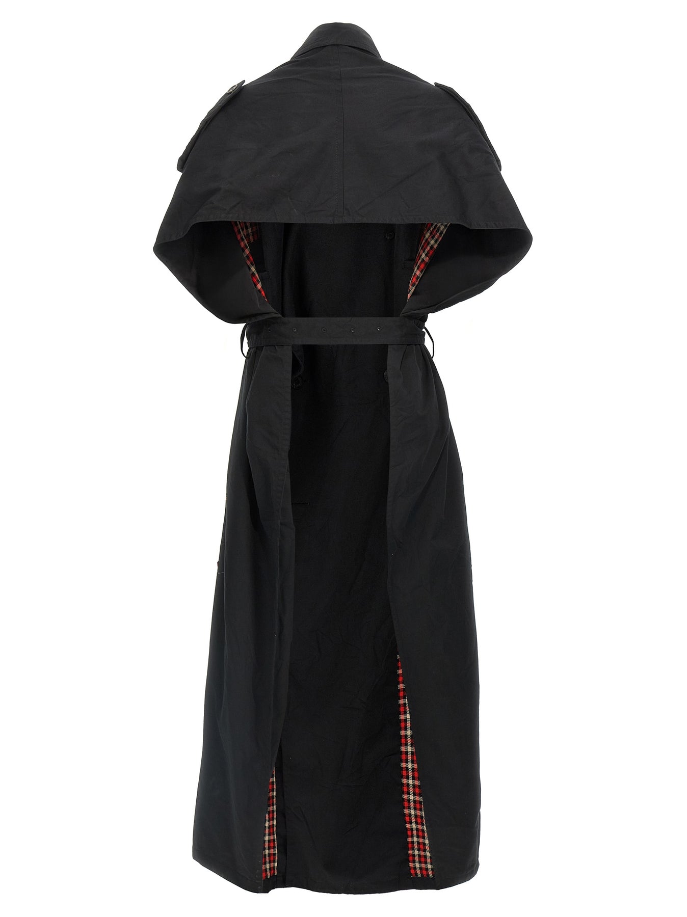 Long cotton gabardine trench coat with check print cotton lining, stole model with open back, sleeveless, front button closure, pockets, removable belt.