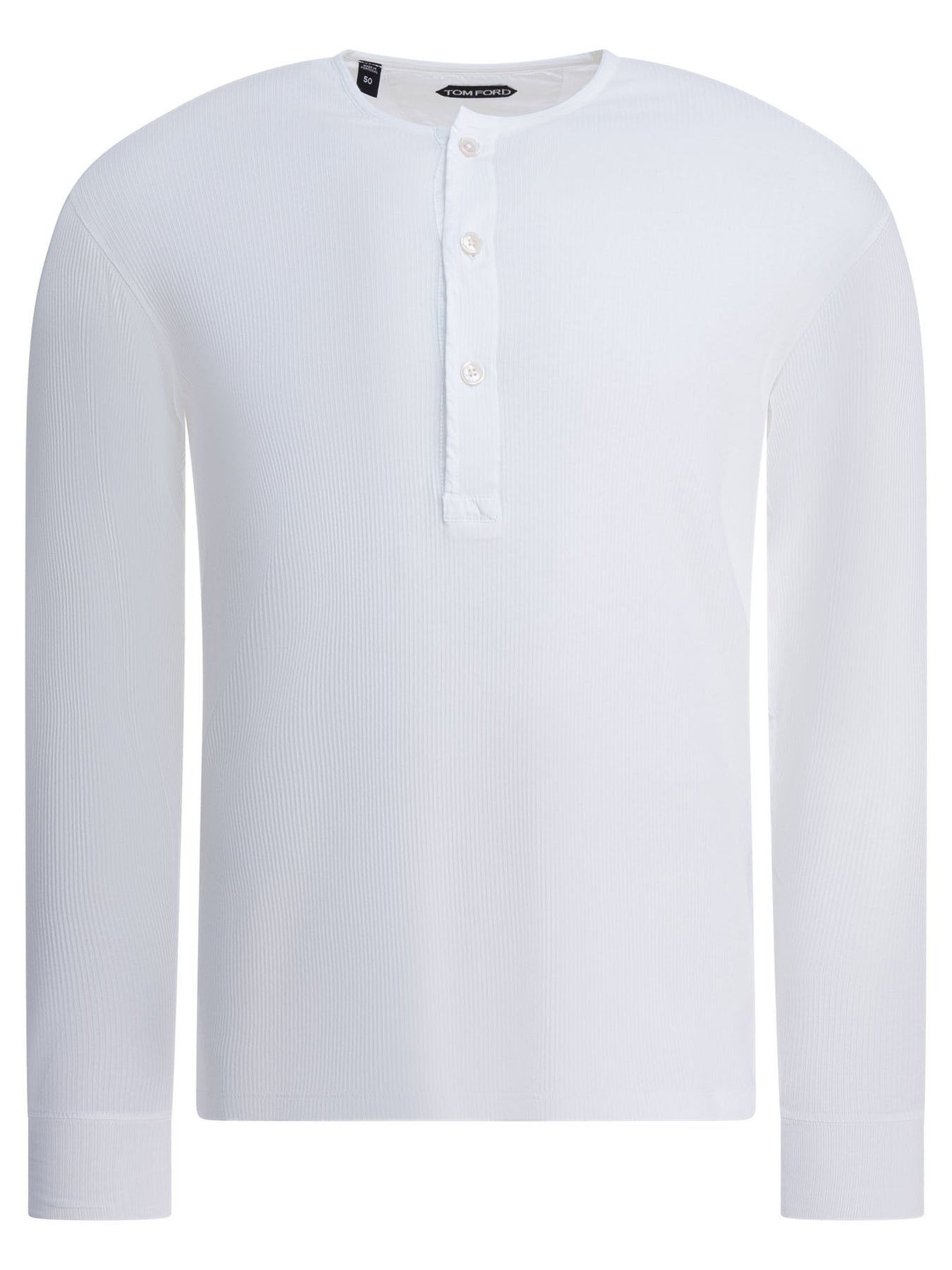 Tom Ford "Henley" T-shirt features a stretch-cotton construction, featuring a crew neck design and a series of buttons on the front. The silhouette follows essential lines, with a straight hem and long sleeves. The fabric offers a compact, uniform surface designed to hold its shape over time. All functional elements are integrated without accessory embellishments or overlays. || - Solid color - Long sleeves - Crew neck - Front buttons - Straight hem - Regular fit