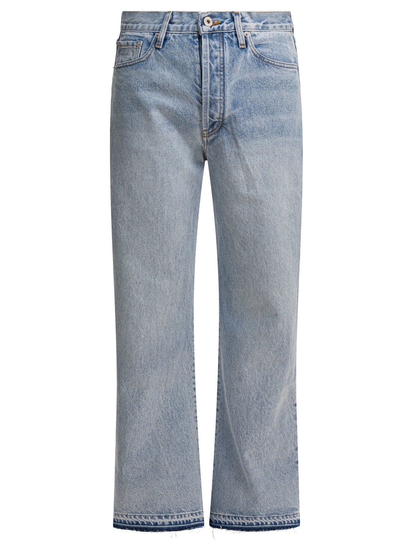 Gallery Dept. "Melrose" jeans, made of denim, feature five-pocket structure with wide fit and leg opening. The model incorporates an embroidered GD pin on the coin pocket, released hem and leather-colored jacron with Gallery Dept. logo embossed on the back waistband. The silhouette maintains a straight line with functional details visible throughout the construction. || - Denim - Mid-rise - Five-pocket construction - Wide leg opening - GD pin embroidered on coin pocket - Leather-colored Jacron with embossed logo - Released hem - Relaxed fit