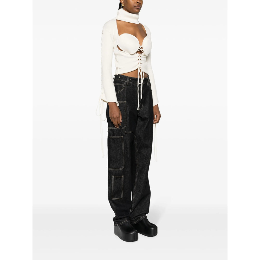 chalk white knitted construction long sleeves roll neck front tie fastening tied cuffs curved hem cropped