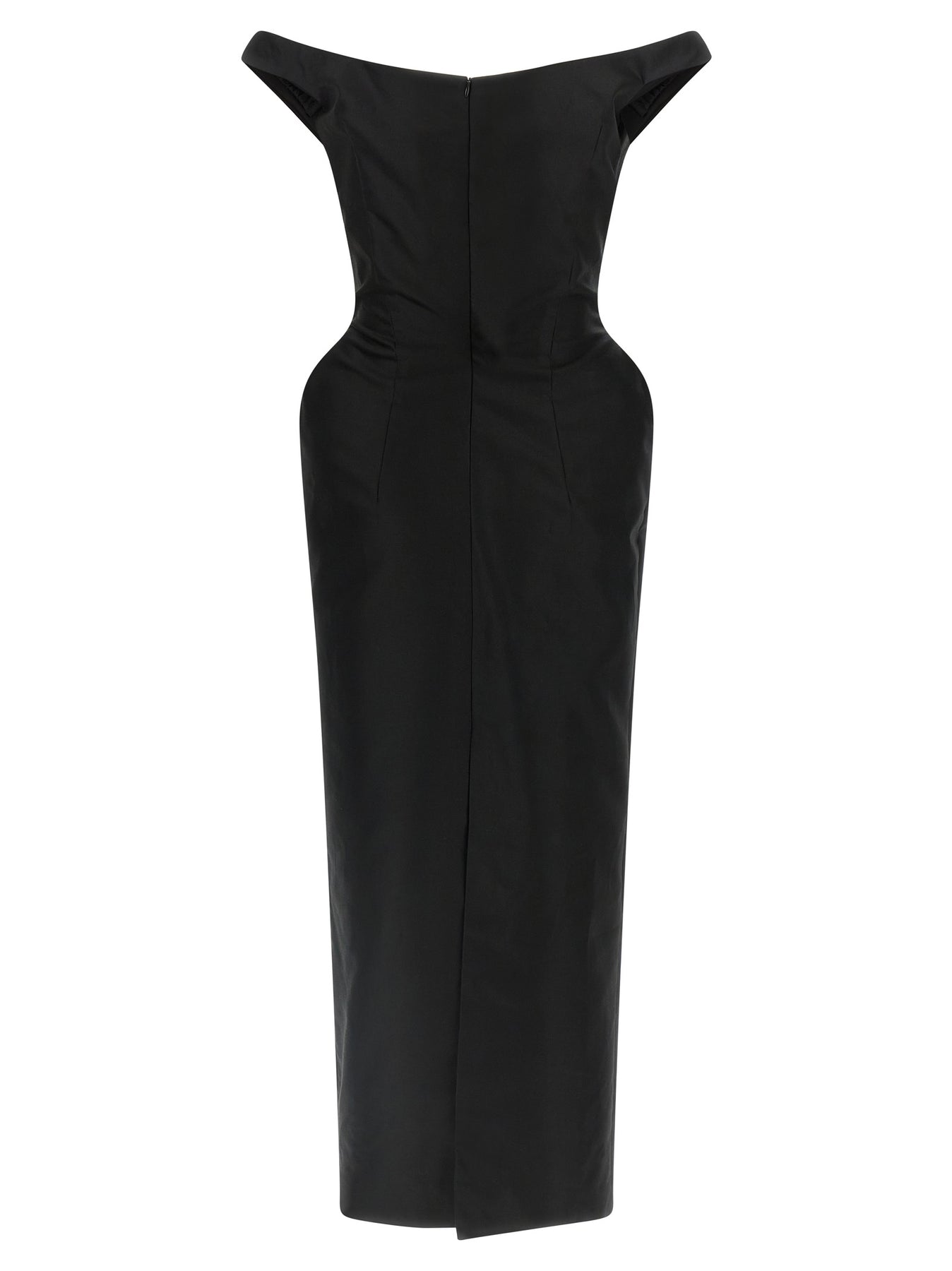 '15' off-the-shoulder cotton midi dress with hourglass silhouette with square neckline and tight bodice, cushions on the hips, dropped shoulder strap, wide slit and back zip closure.