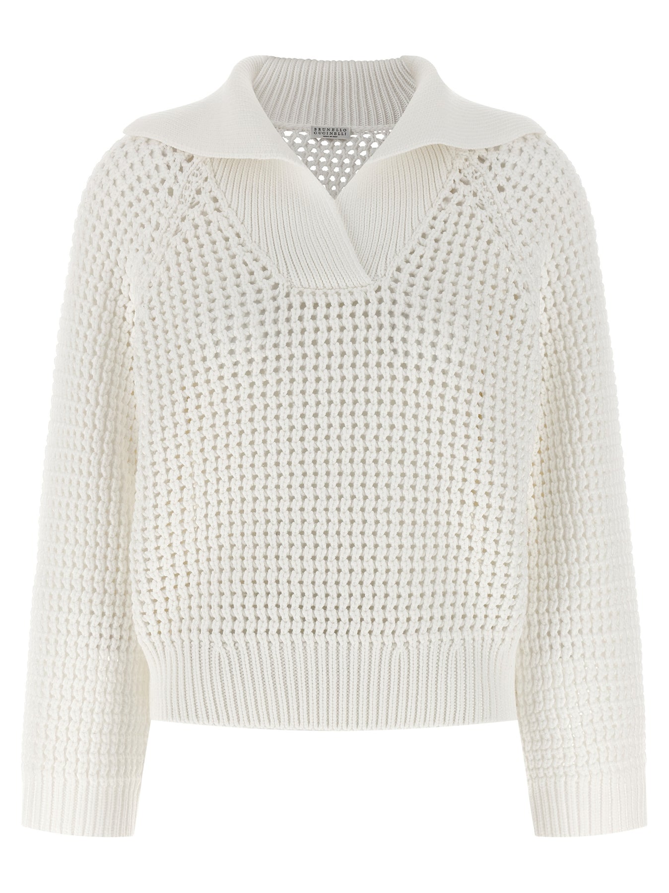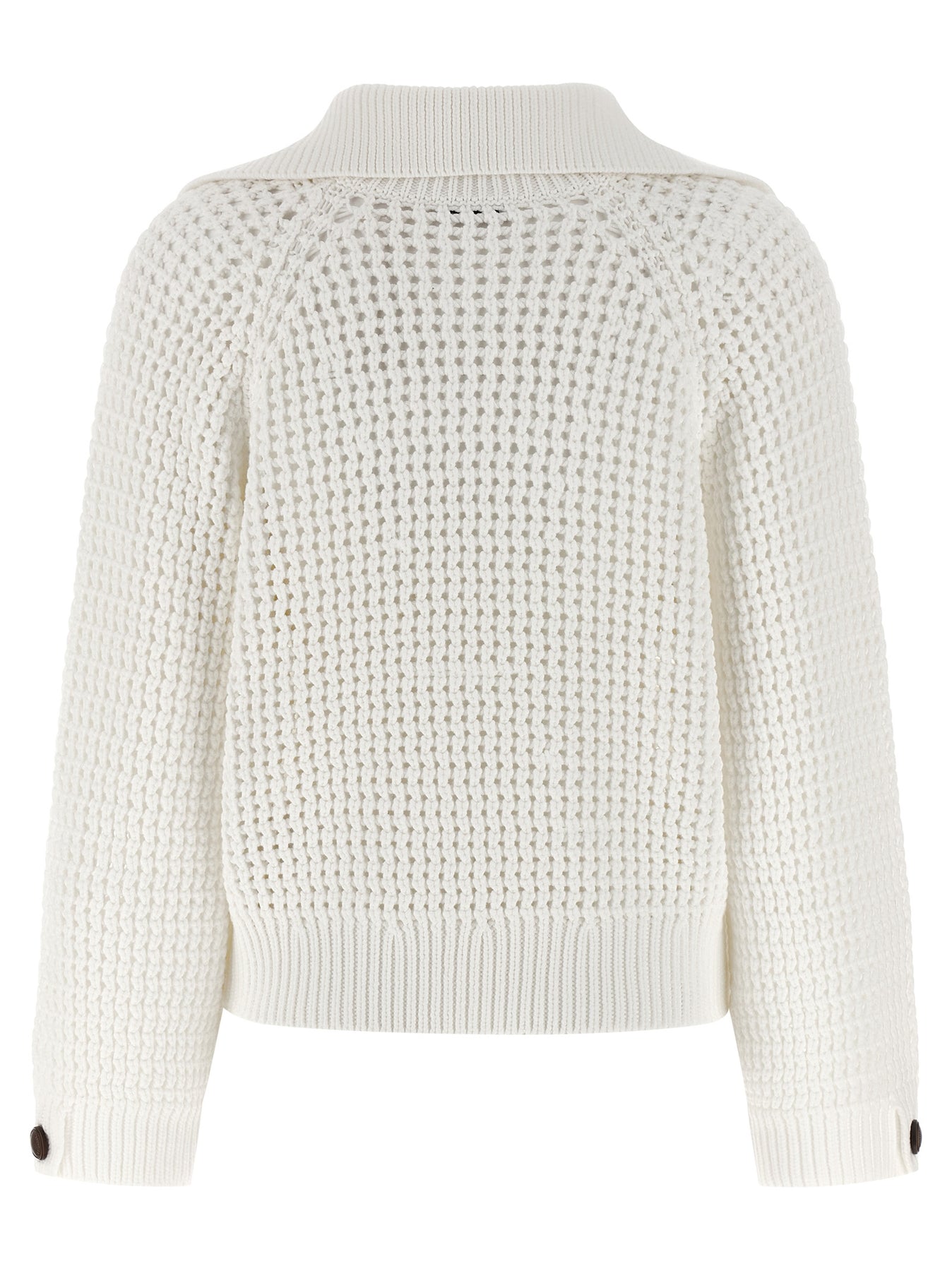 Thick-textured, openwork sweater with V-neck with shirt collar, long sleeves with cuffs.