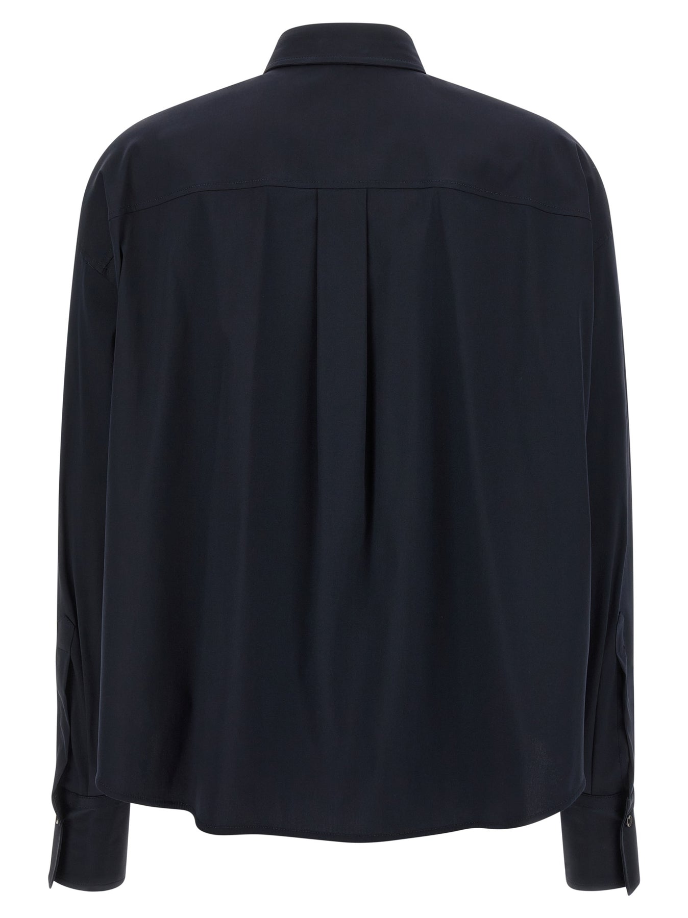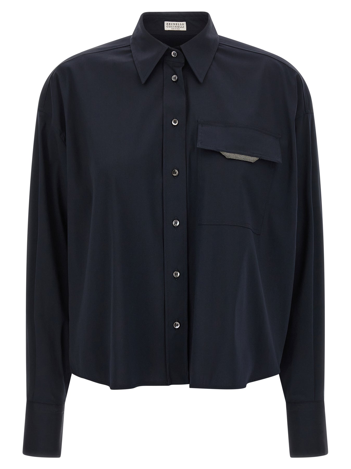Stretch cotton poplin shirt, breast pocket with Monile 'Shiny Flap Detail', front button closure, slightly wide long sleeves with cuffs and dropped shoulders.