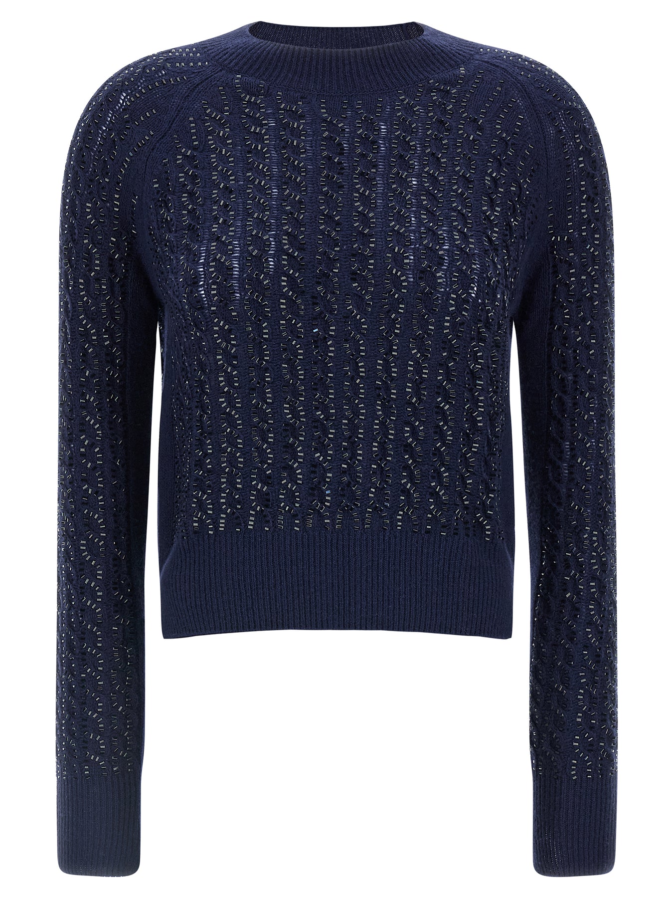 Virgin wool and cashmere blend sweater with braided knit with all-over baguette studs, crew neck, long cuffed sleeves.