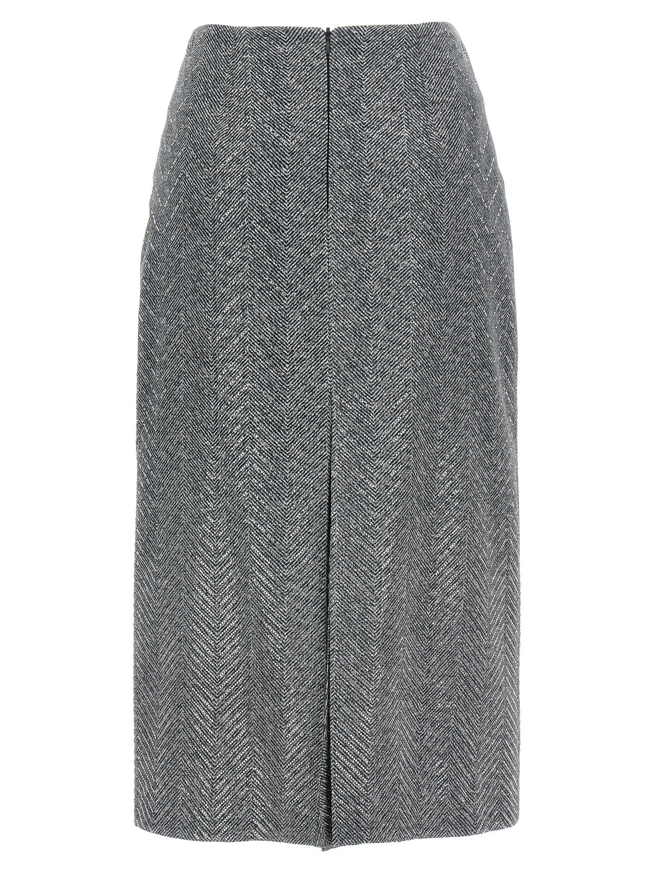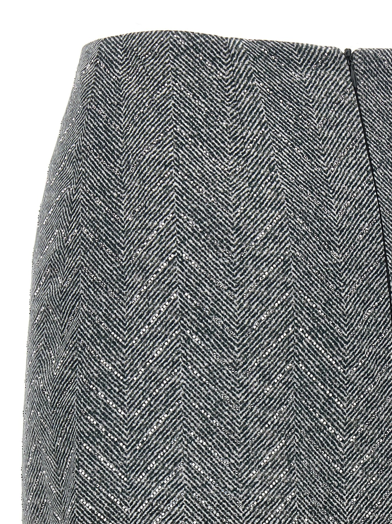 Midi skirt in herringbone patterned silk with all-over rhinestone application, zip closure, back split, lining.