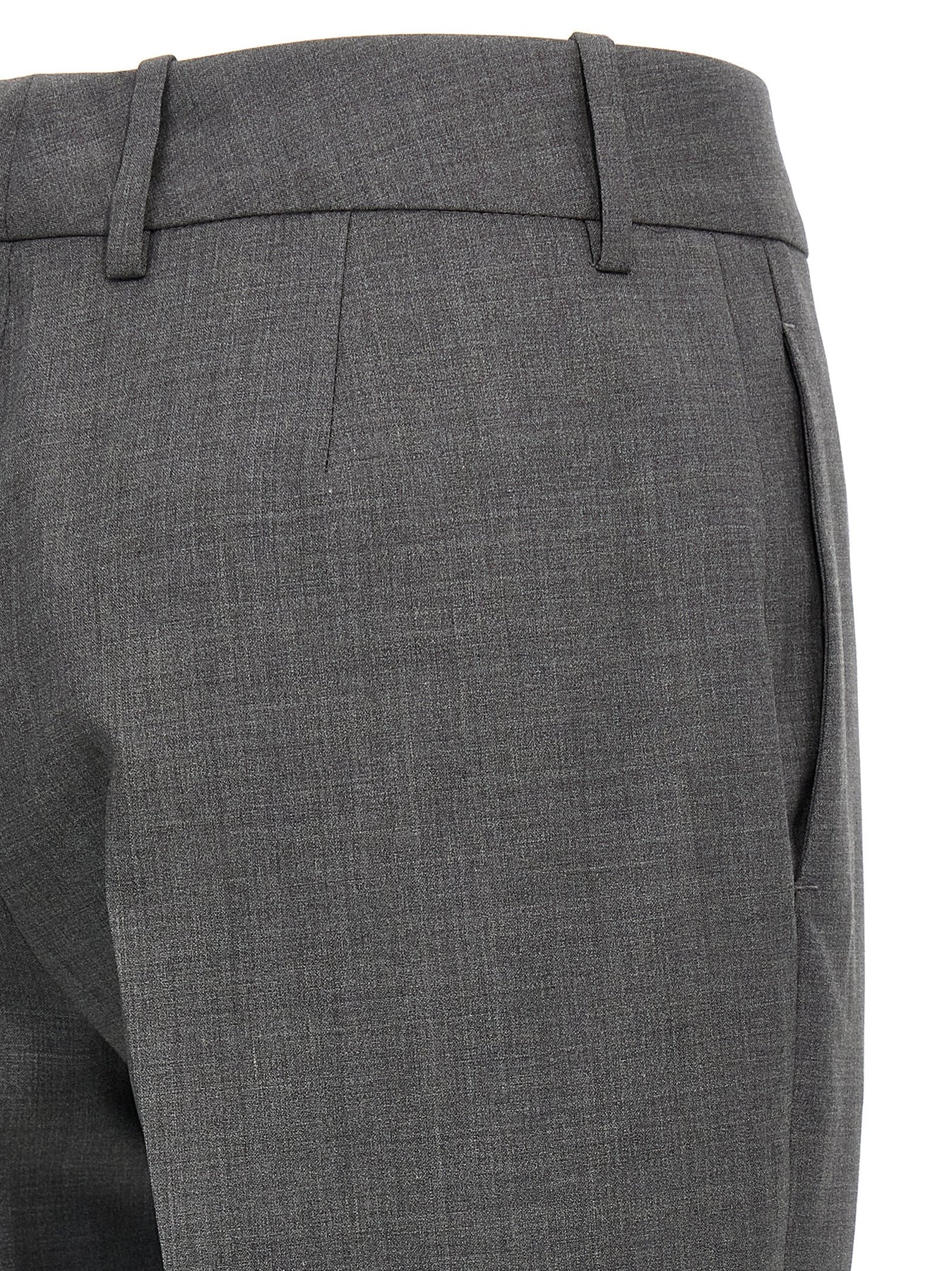 Melange virgin wool trousers, straight leg with stretched crease, hook zip and front button closure, pockets.