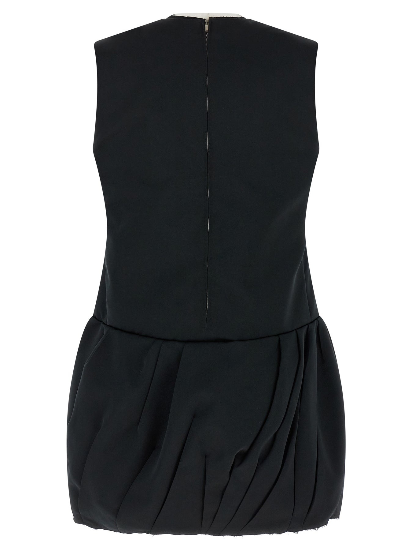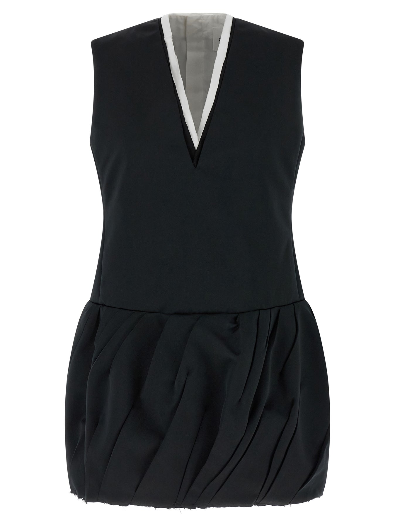 '240' technical duchesse mini dress, V-neck with several layers of contrasting fabric, sleeveless, balloon skirt with irregular pleats, raw cut hem and back zip closure.