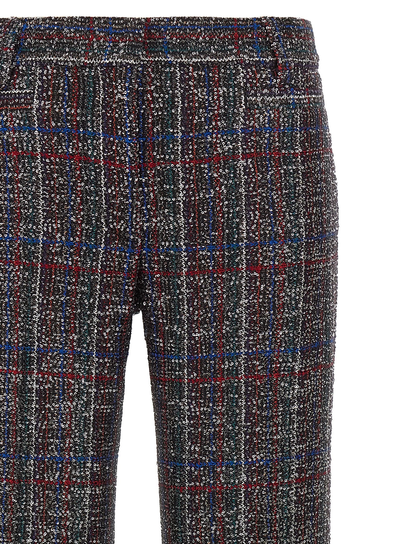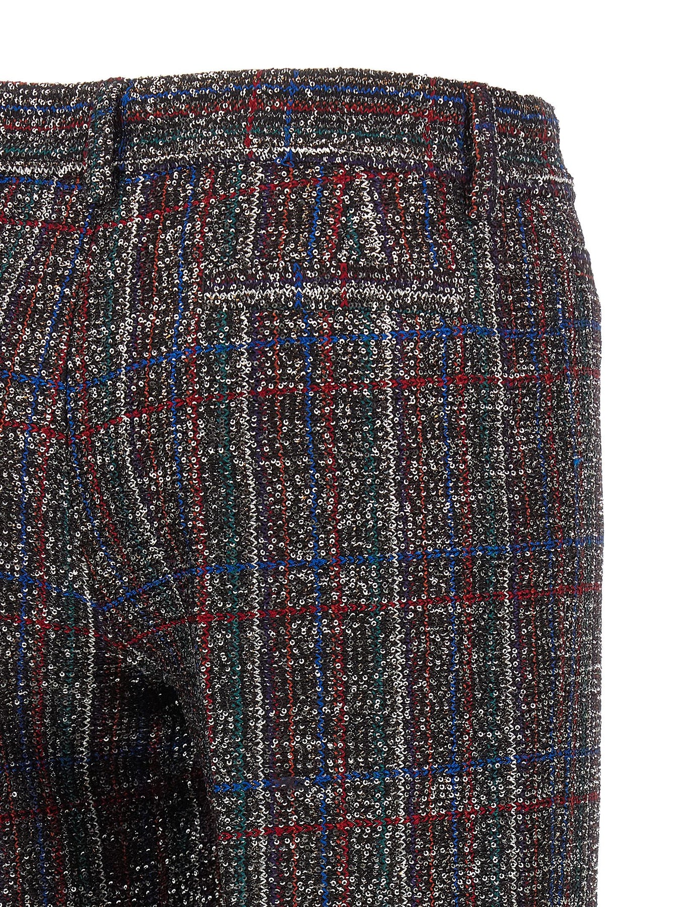 Tartan patterned viscose blend pants with all-over micro sequin application, lining, flared leg, zip and front button closure, pockets.