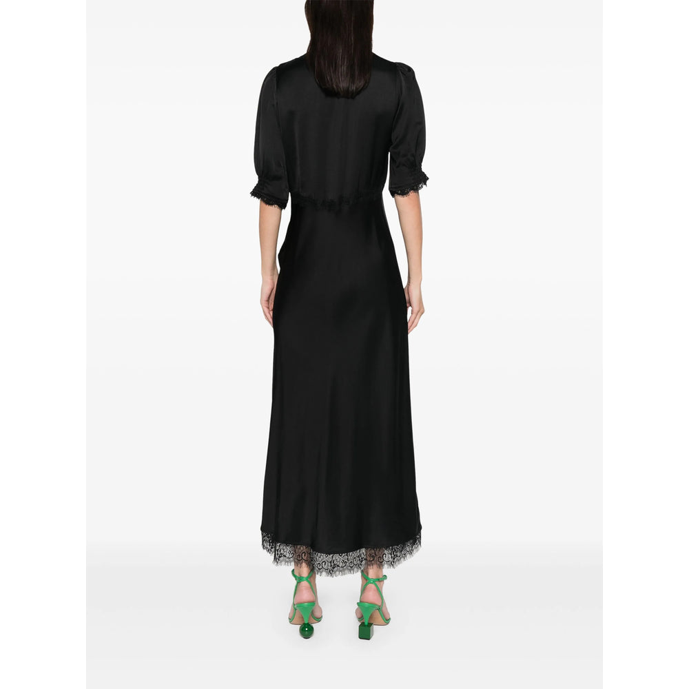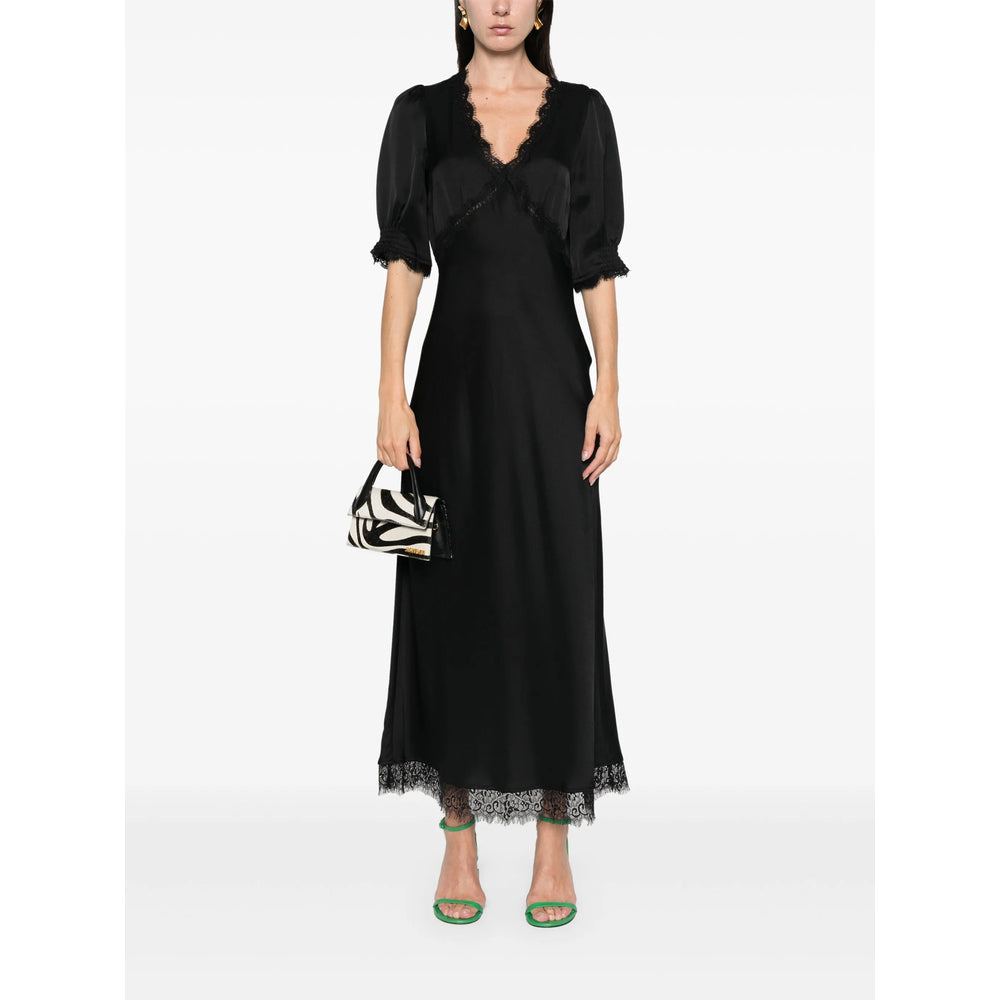 black satin finish side zip fastening V-neck lace detailing short puff sleeves unlined bias cut