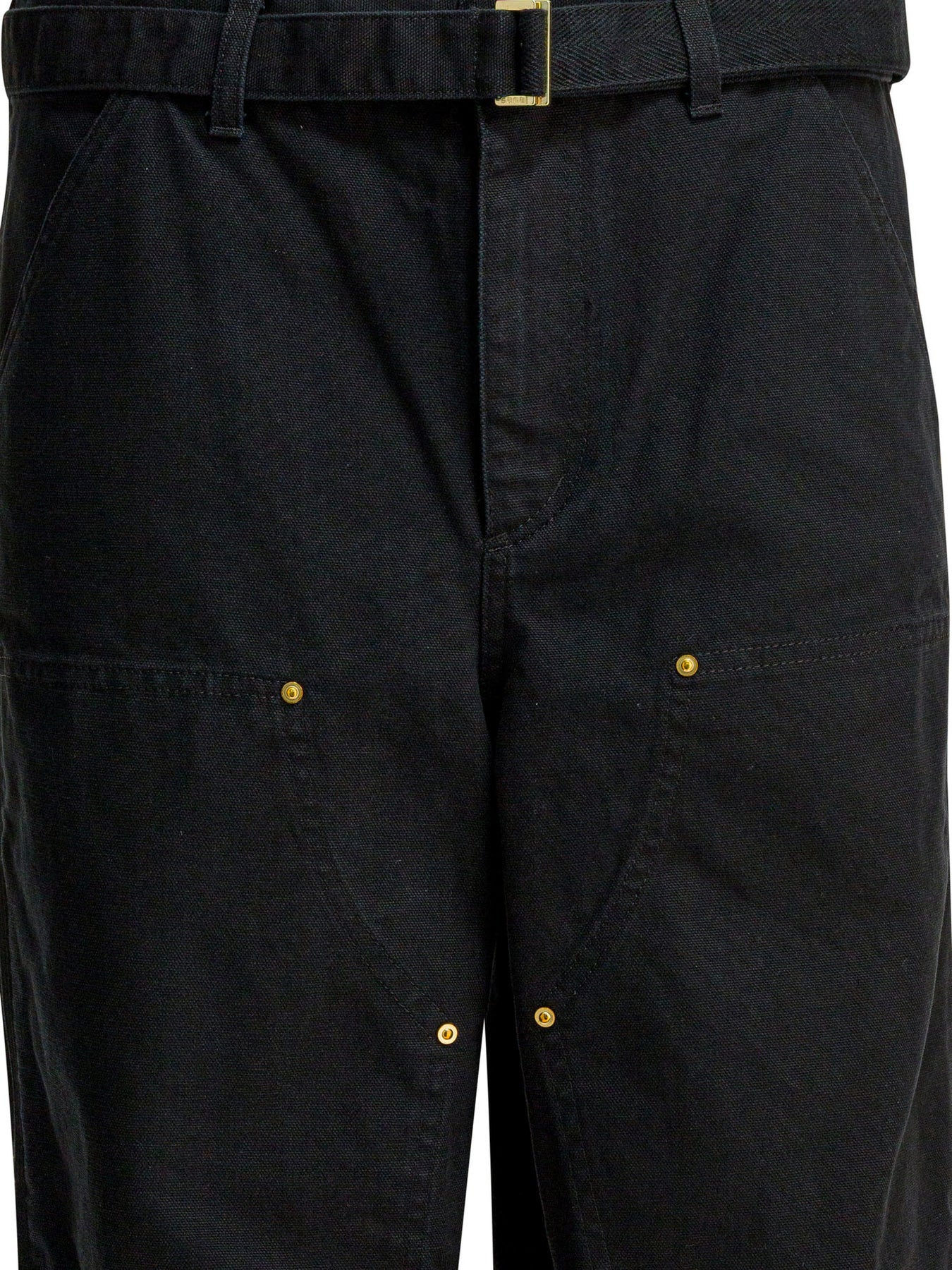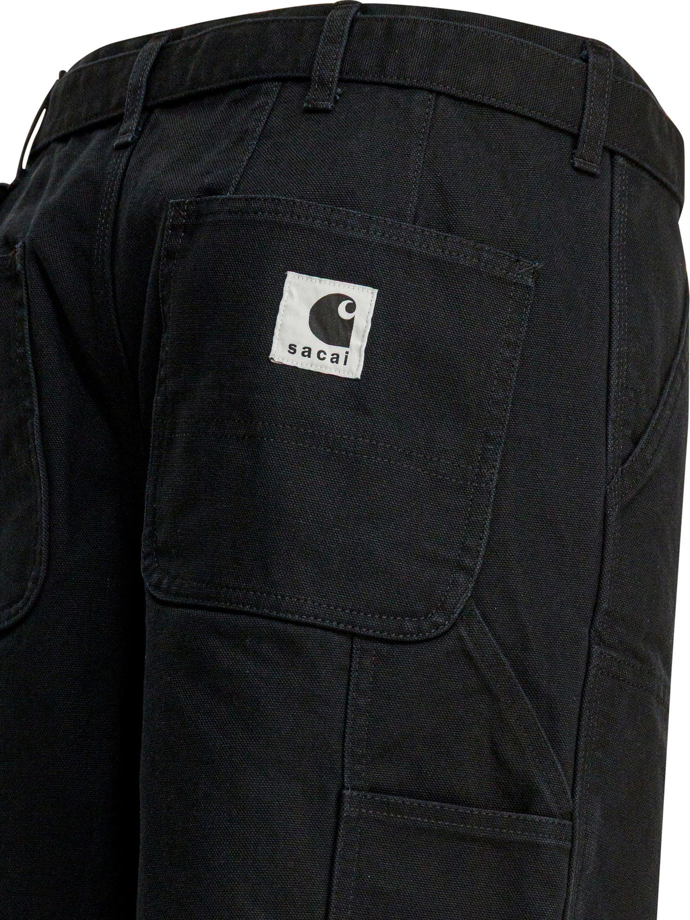 "Duck - Sacai x Carhartt WIP" Sacai "Duck - Sacai x Carhartt WIP" pants, constructed of heavy duck canvas, feature a hybrid structure between Carhartt WIP's double-knee and the Sacai line. The double-knees are stitched from the inside, with no visible seams on the surface. The wide silhouette emphasizes the fabric's natural stiffness, while the garment-washed finish lends a worn-in look. A woven label with shared branding is applied to one of the pockets. || - Logo on woven label with shared Carhartt WIP and Sacai branding - Mid-rise waist - Double-layered knees with inside seam - Front flap and button closure - Relaxed fit
