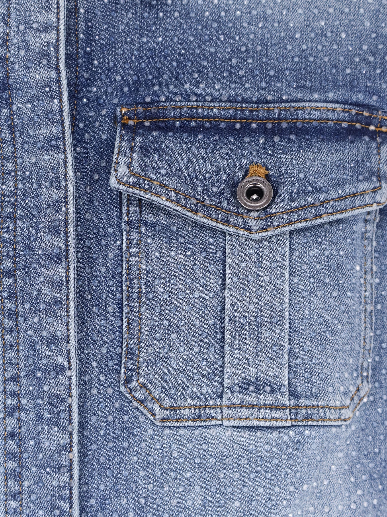 Snap button closure Pointed collar Four front pockets Long sleeves with cuffs Belt loops All-over rhinestones Padded shoulder straps 99% cotton, 1% elastane SKU: RS26801JSABLBLUE