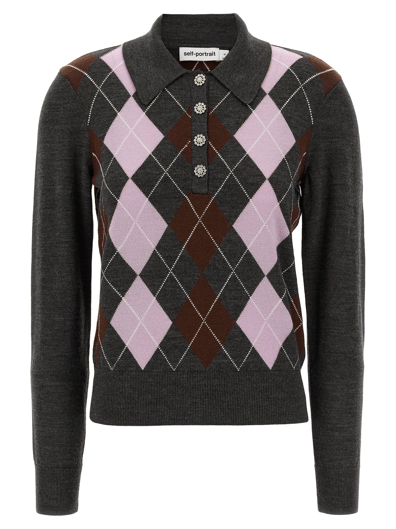 Grey Argyle Lightweight' Argyle wool sweater with embroideries on the front and back, polo shirt style with jewel collar and buttons, long cuffed sleeves.