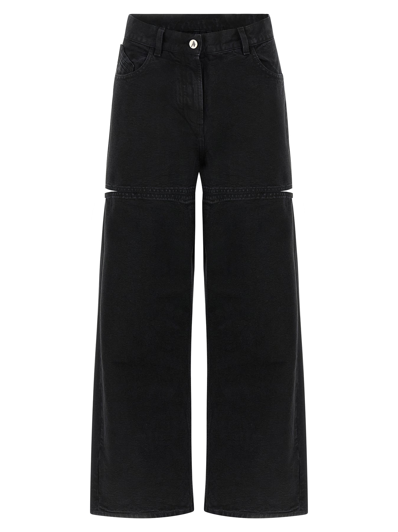 Garment-dyed cotton denim jeans, low crotch, back cut-out details, wide straight leg, front zip and button closure, five pockets, leather logo tag.