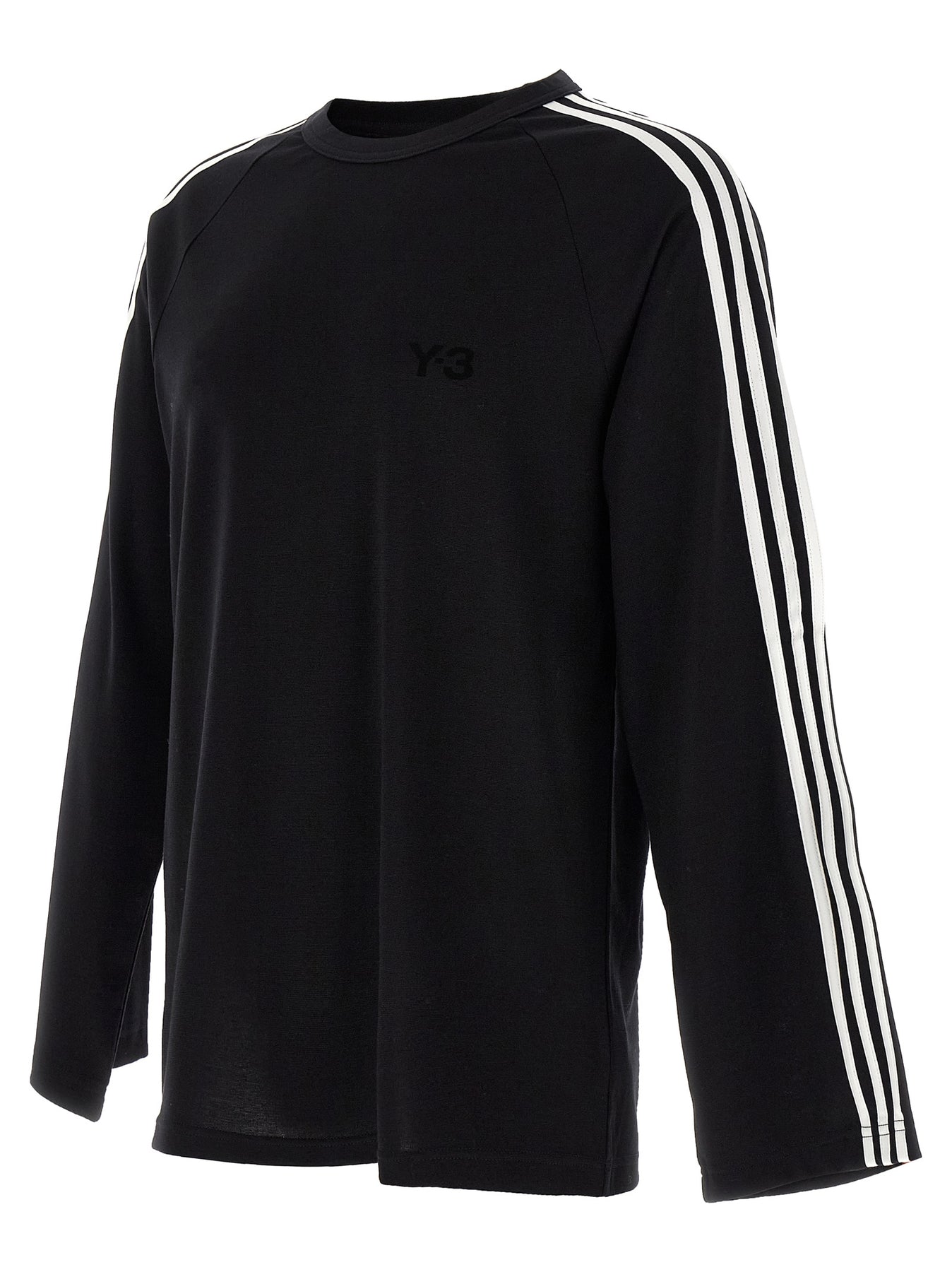 'Y-3 Long Sleeve Tee 3-Stripes' T-shirt in lyocell, nylon and sheep wool blend with contrasting details, tone-on-tone logo at the front, crew neck, long flared sleeves with dropped shoulders, part of the strips are reinforced with wire.