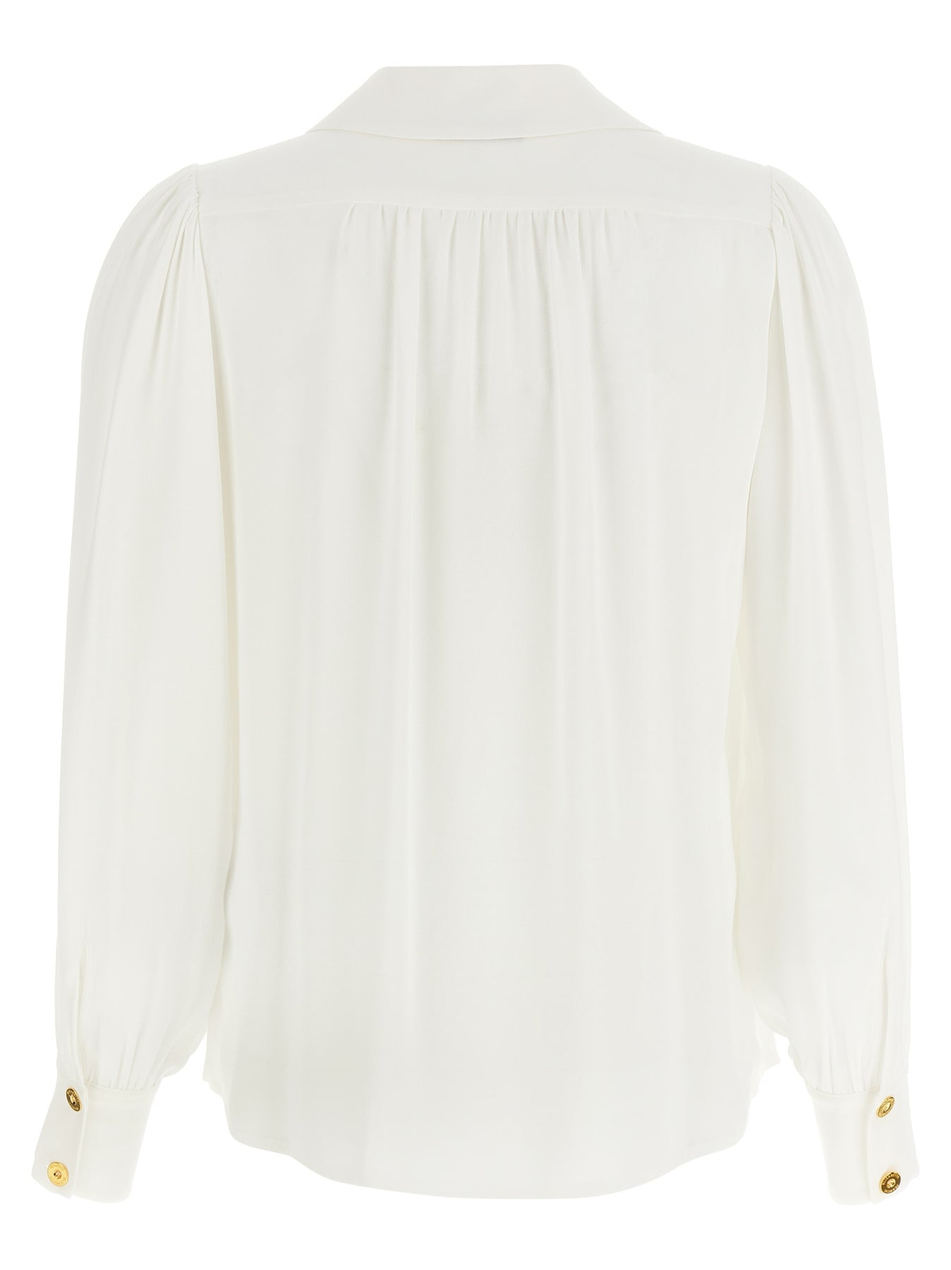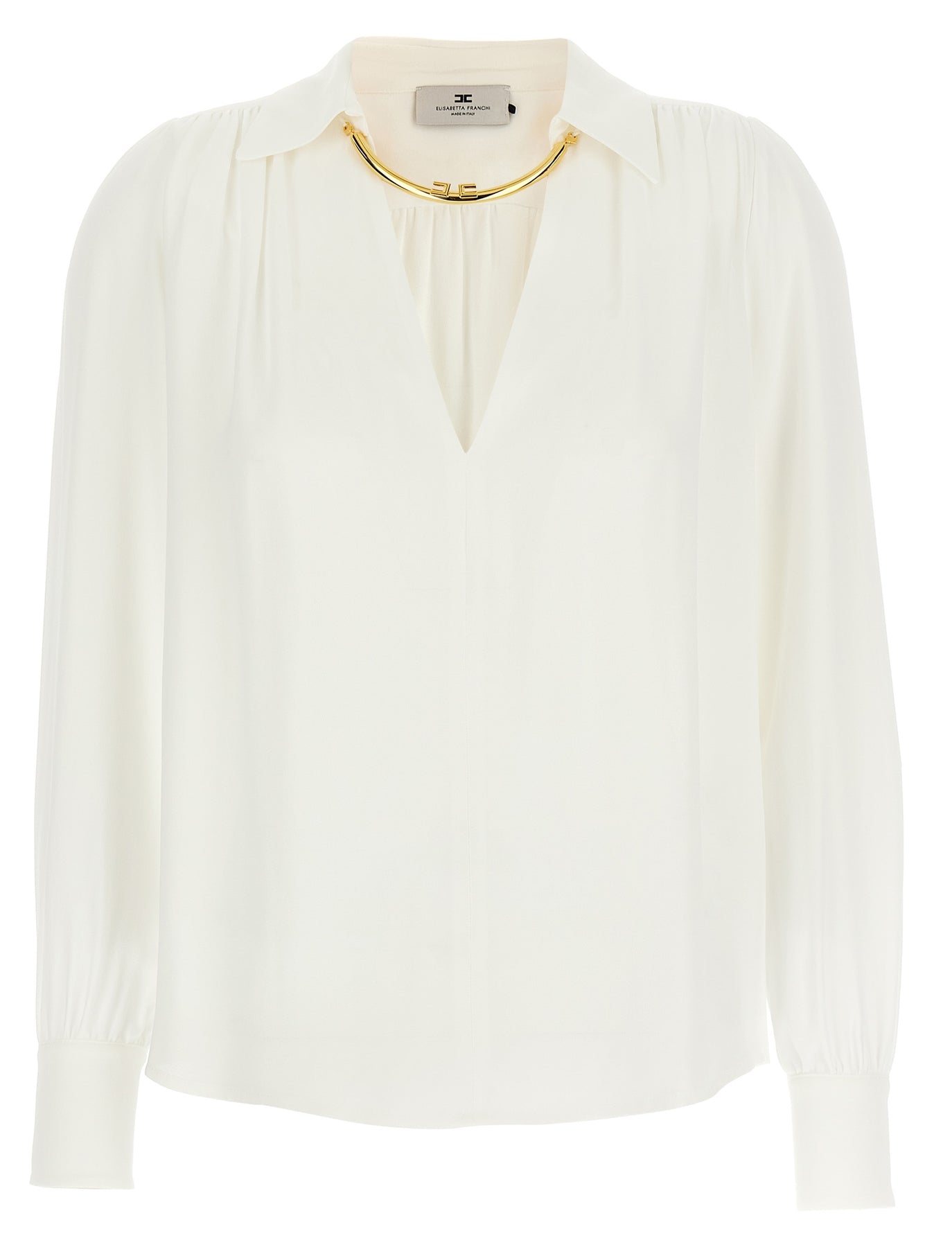 Viscose georgette shirt with V-neck, collar with removable metal necklace detail, ruffled shoulders, long cuffed sleeves.