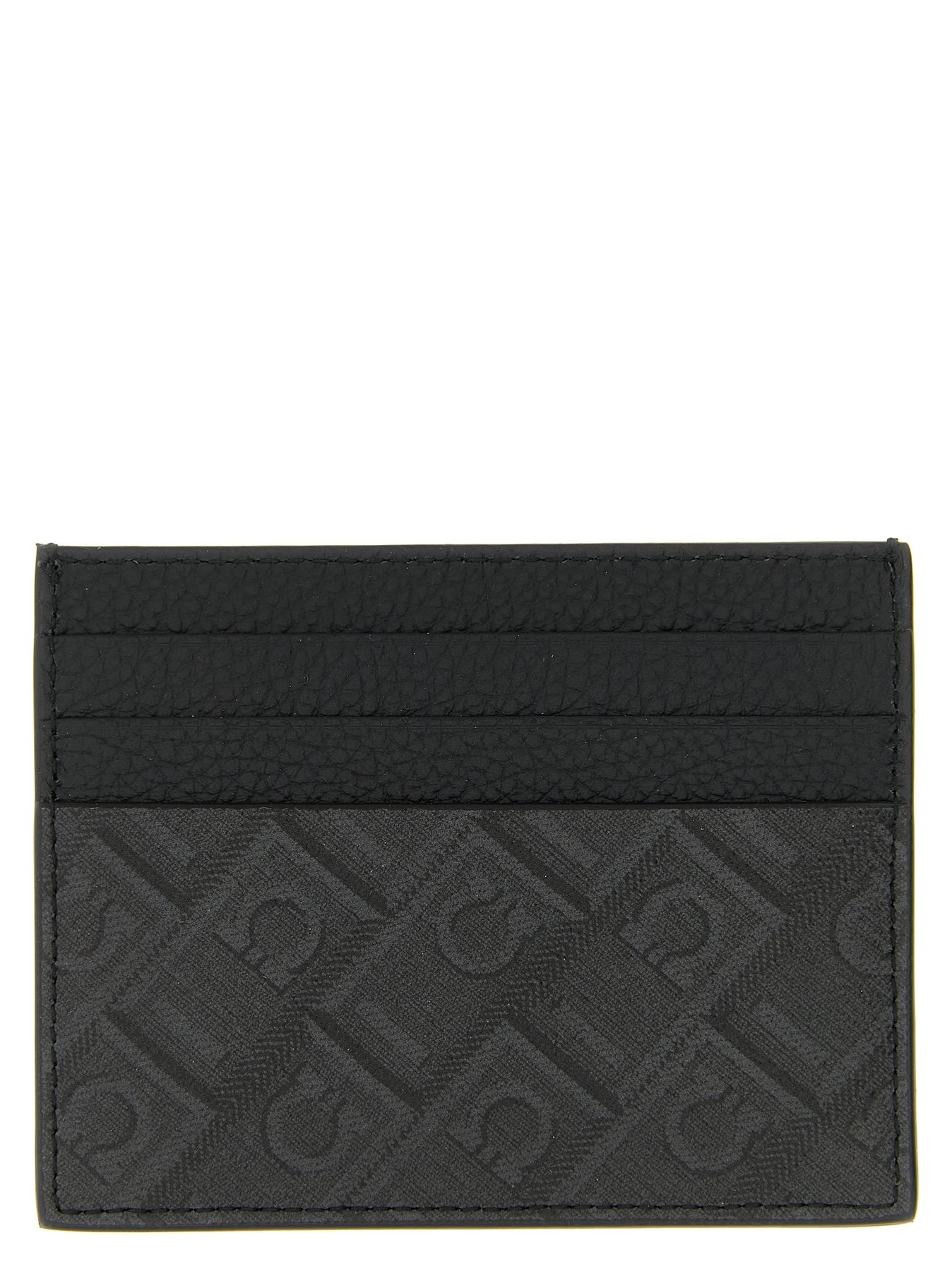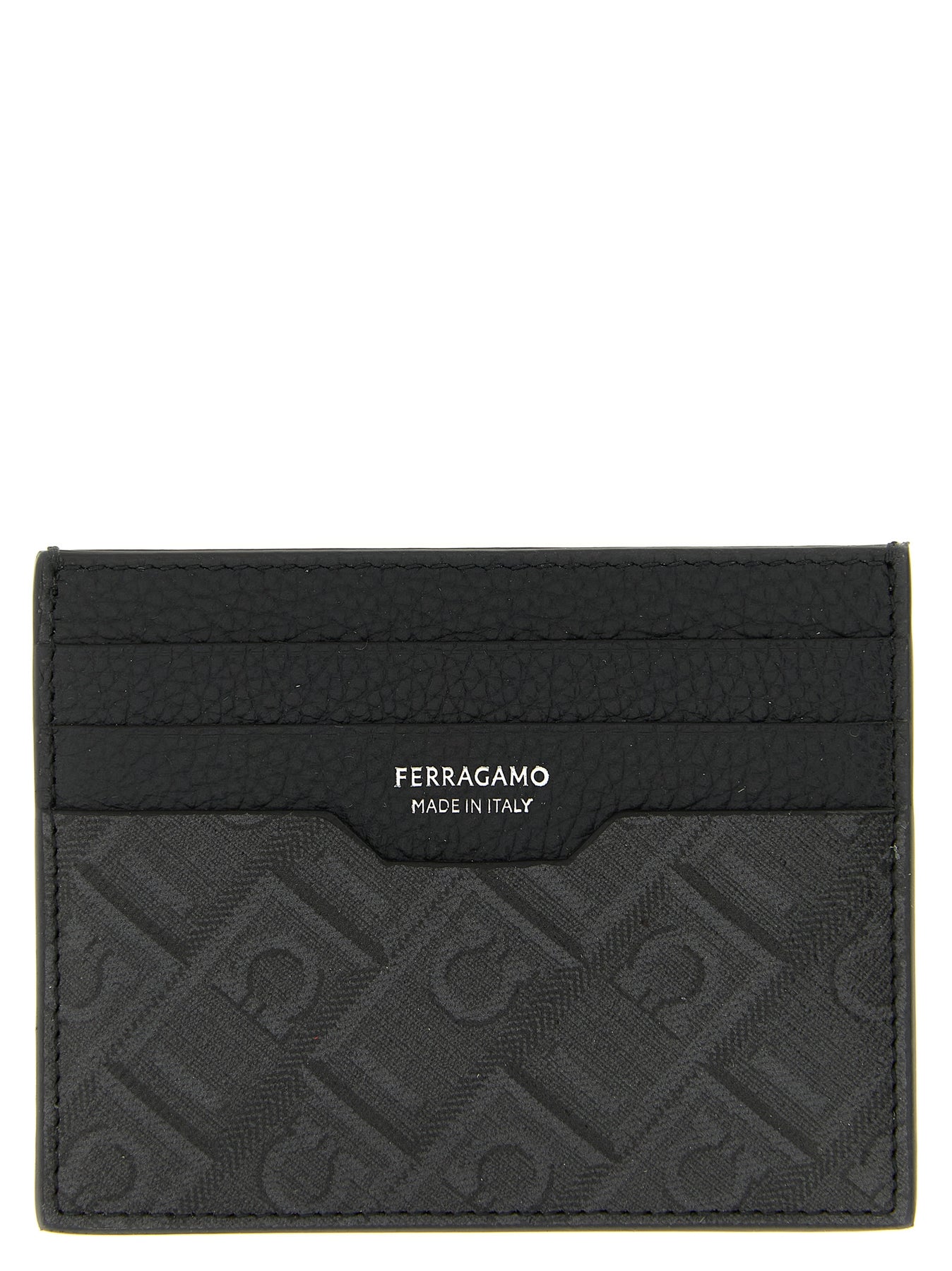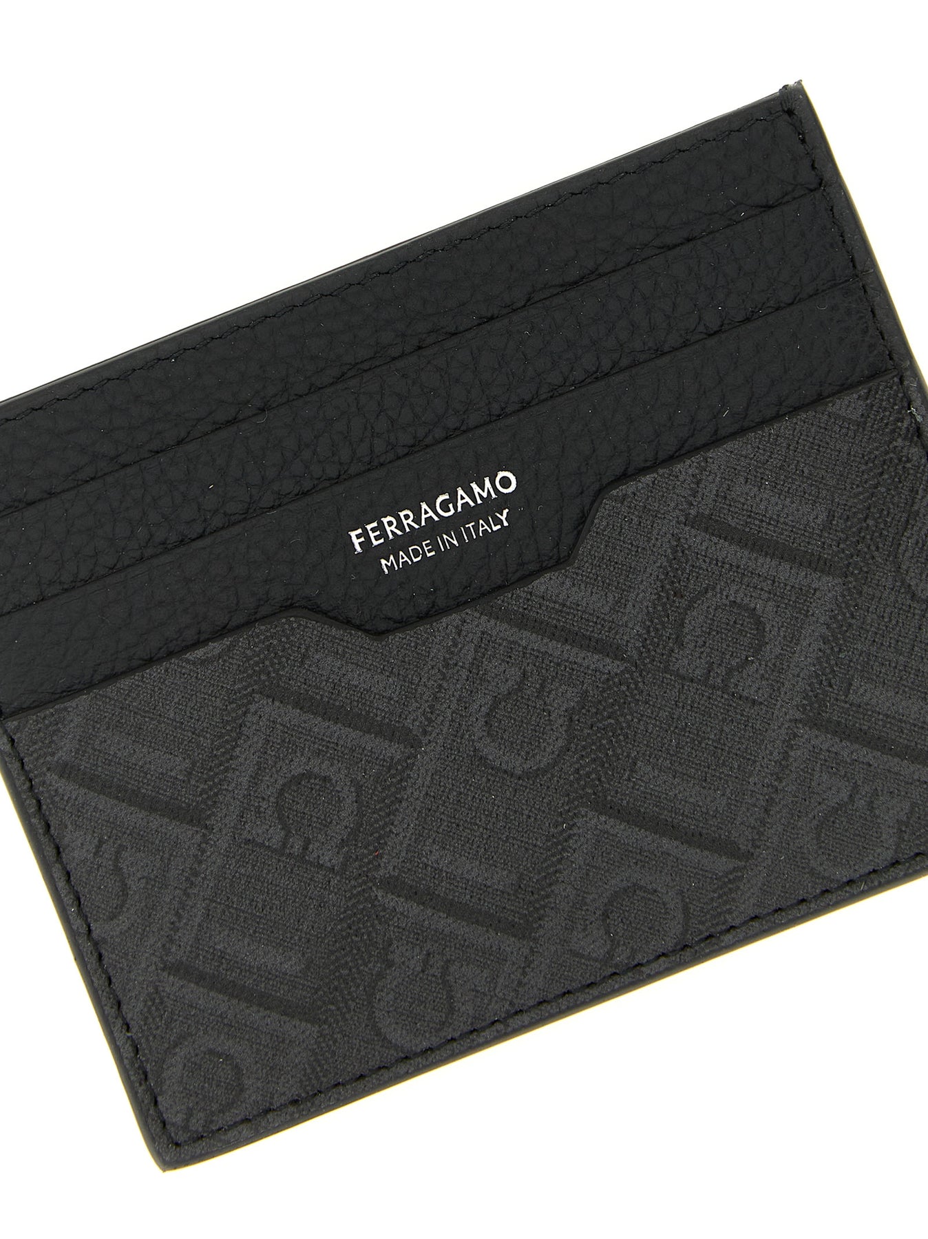 Hammered calf leather card holder with outer panels in coated fabric with tone-on-tone 'Ferragamo Monogram' print, and embossed logo on the front.