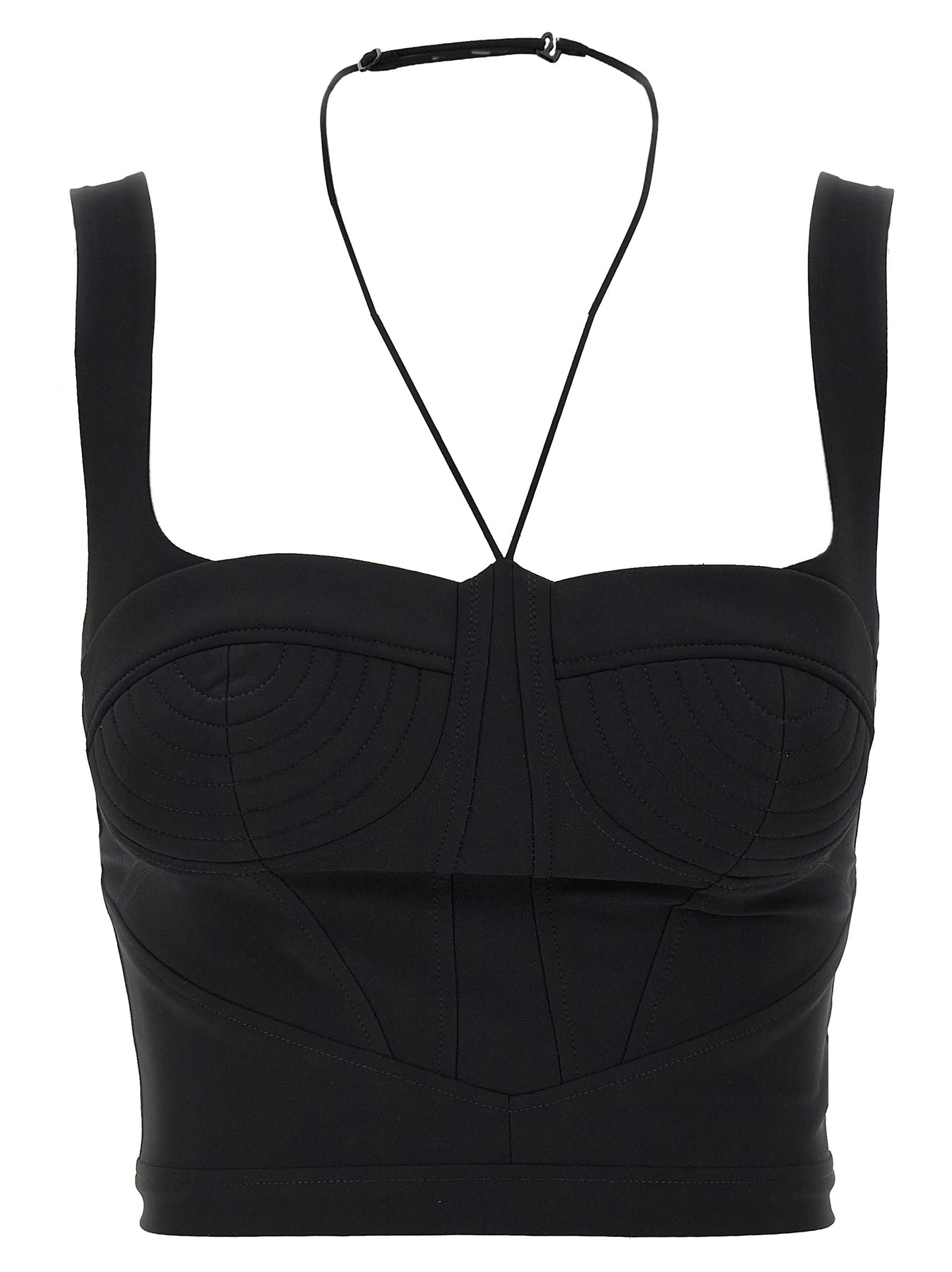 Stretch fabric top, shaped bustier style, thin straps, lacing at the neck, back zip closure.