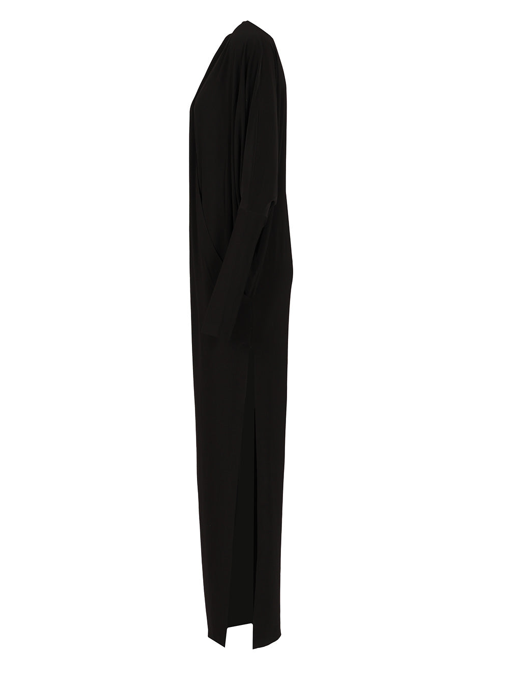 "Dolman" dress in stretch fabric by Norma Kamali, with side slit, Dolman sleeves and V-neckline