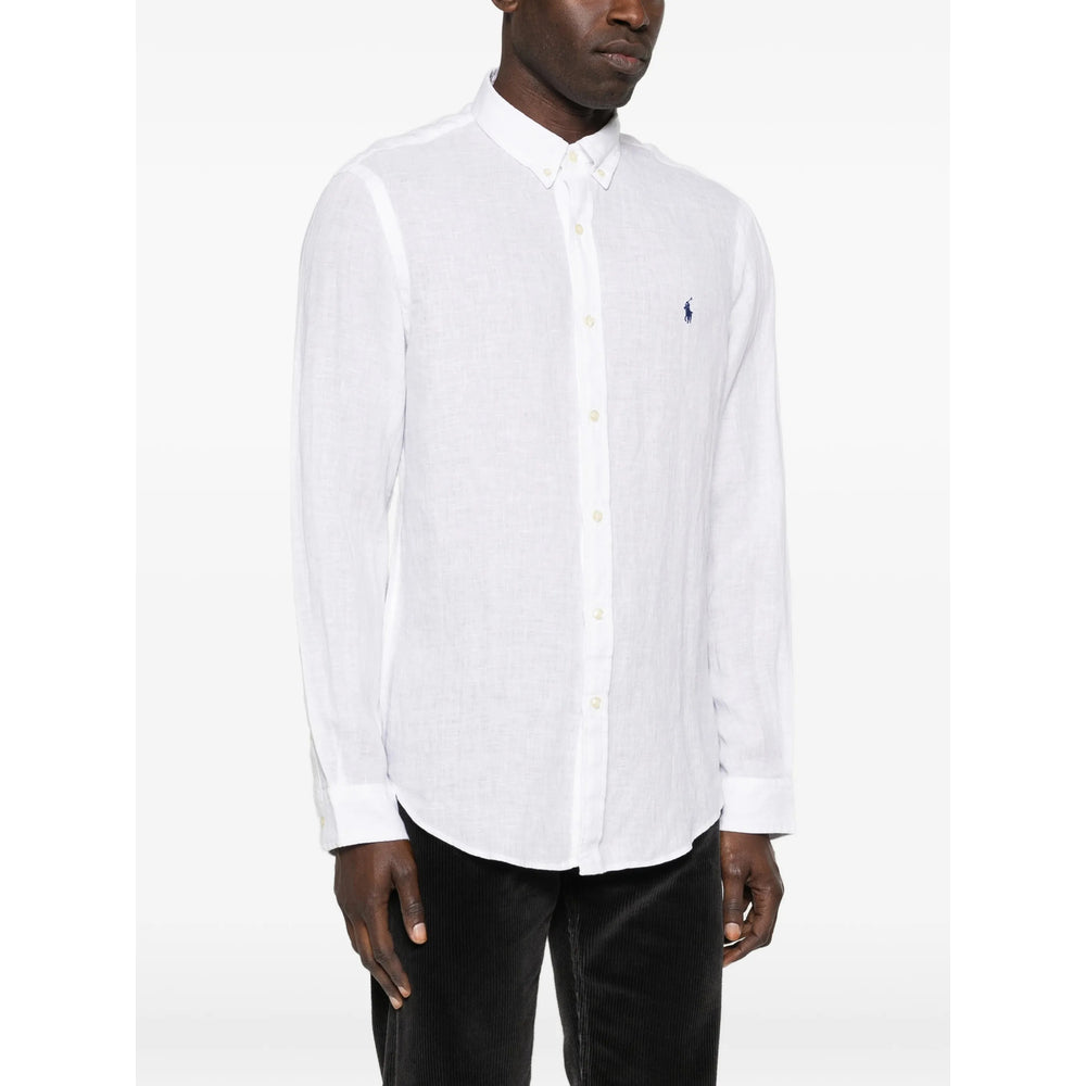 white button fastening long sleeves buttoned cuffs chest logo