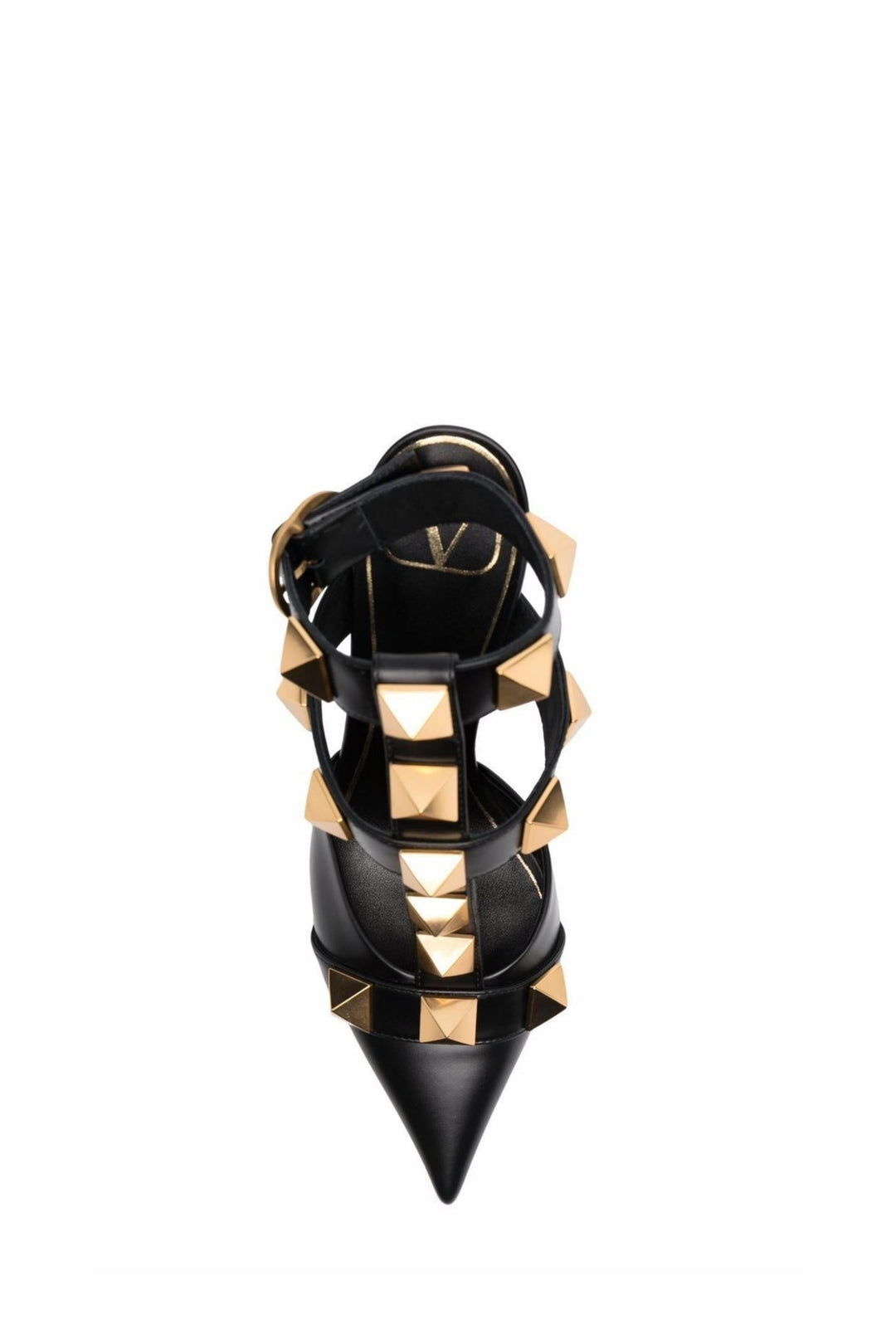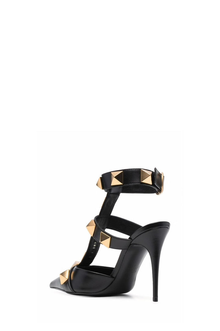 Valentino Garavani Décolleté in black leather. Straps decorated with the iconic macro metal studs with antique brass finish. Ankle strap with metal side buckle, leather lining, leather sole.