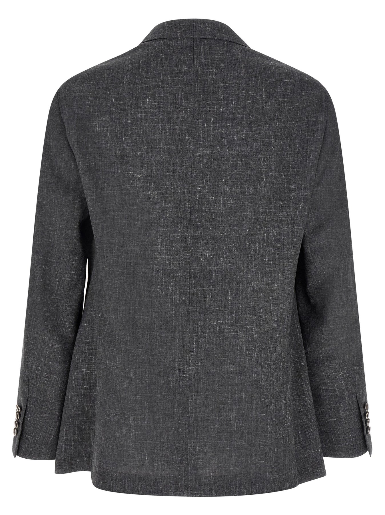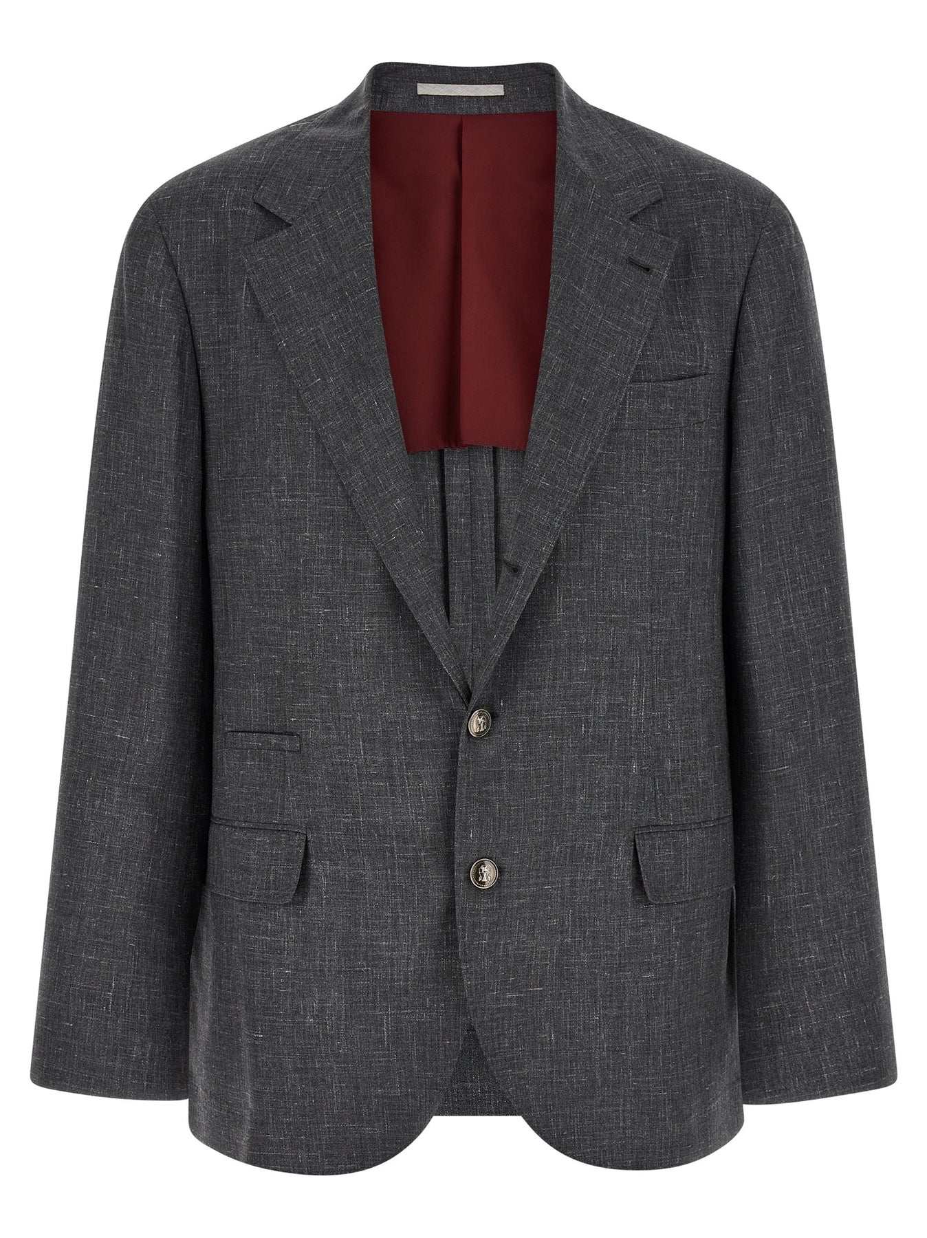 Blazer in flamed wool, silk and linen canvas with a soft hand, deconstructed single-breasted model with button closure, three buttons in ironed metal with two fronts, mirror lapels, flap pockets, ticket pocket and chest pocket, two inside pockets with button closure and pen pocket, 'Spalla Solomeo', cuffs with opening buttonholes, half cupro lining, rear slits.