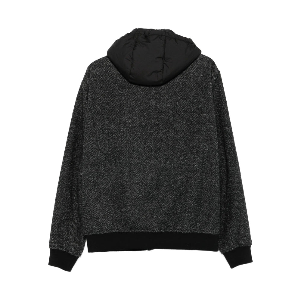 grey herringbone weave drawstring hood button fastening flap pockets ribbed hem long sleeves