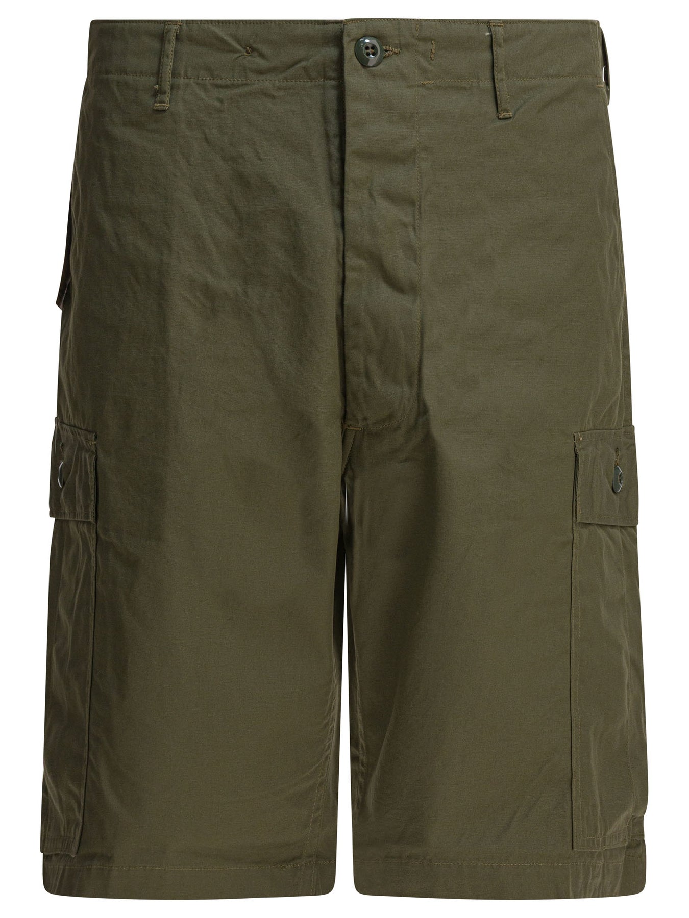 Buzz Rickson's "Combat" shorts made of lightweight, breathable cotton poplin. The construction features a knee-length silhouette with a front button placket and adjustable waistband via side tabs. There are two slanted front pockets, two back flap pockets and two large cargo pockets at the sides, closed by flaps and fold-over straps. The construction is inspired by tropical military pants, with original functional details. || - Solid color - Mid-rise - 100% cotton - Two front slant pockets - Two back flap pockets - Two side cargo pockets with strap closure - Adjustable waistband with side tabs - Knee length - Relaxed fit