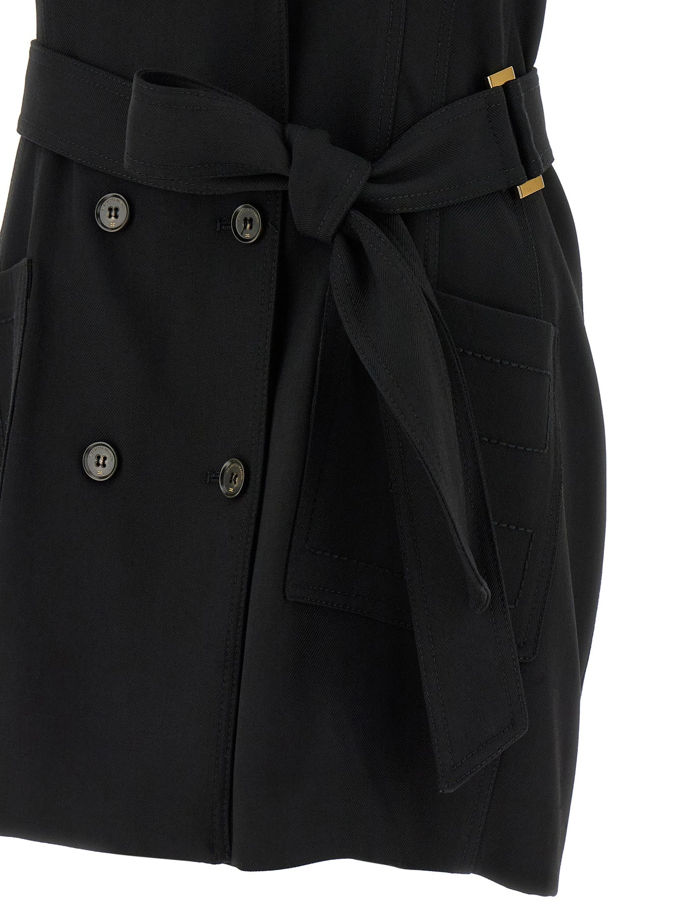Gabardine mini dress, double-breasted vest with front button closure, American neckline with lapels, sleeveless, pockets, sash at the waist, monogram satin lining.