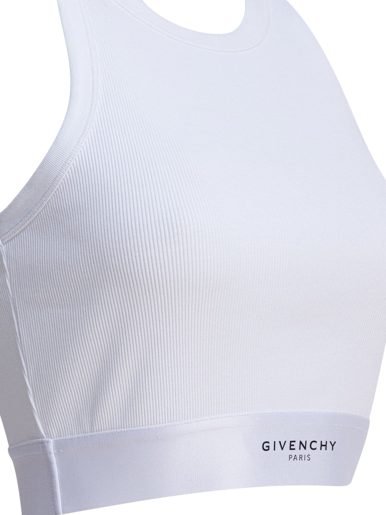 Givenchy logo cropped tank top made from ribbed cotton. Sleeveless construction with a fitted silhouette and round neckline. The bottom features an integrated elasticated band, finished with Givenchy Paris signature printed in contrast. The ribbed knit extends across the entire surface, ensuring a compact and regular texture. The construction responds to a quest for essentiality in visible shapes and details. || - Givenchy logo printed on the bottom band - Cropped design - Sleeveless - Round neckline - Elasticized band at bottom - Ribbed cotton - Cropped fit
