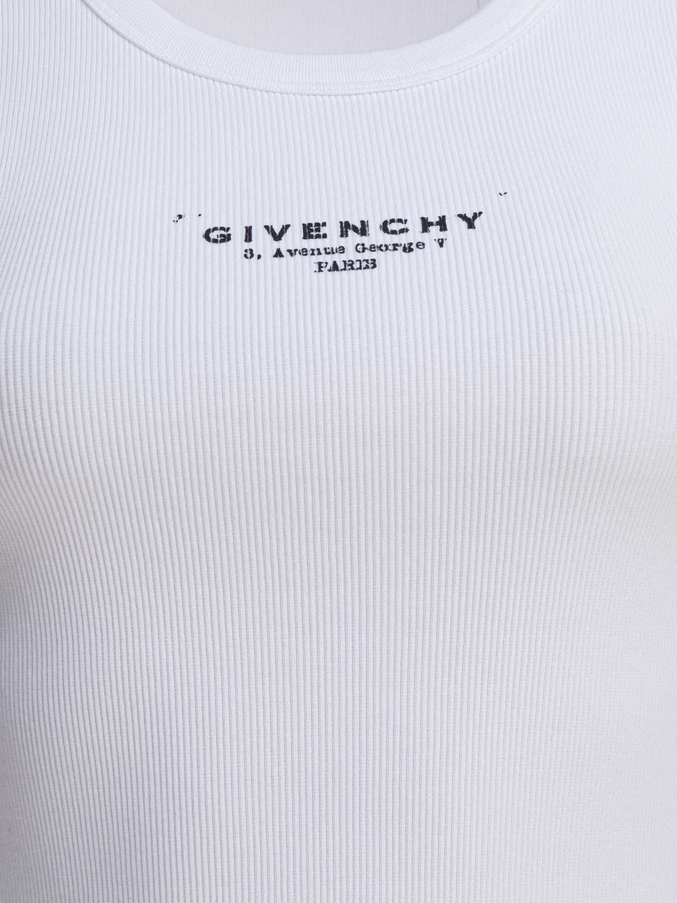 Givenchy logo cotton tank top features sleeveless construction and a fitted silhouette. Made of ribbed fabric that follows the bust line, it features a Givenchy logo print positioned on the front. The main material of construction is cotton with an elastane component, which gives flexibility and containment to the shape. Seams are basic, with clean finishes along the neckline and side hems. || - Logo printed on the front - Sleeveless - Ribbed knit - Regular fit